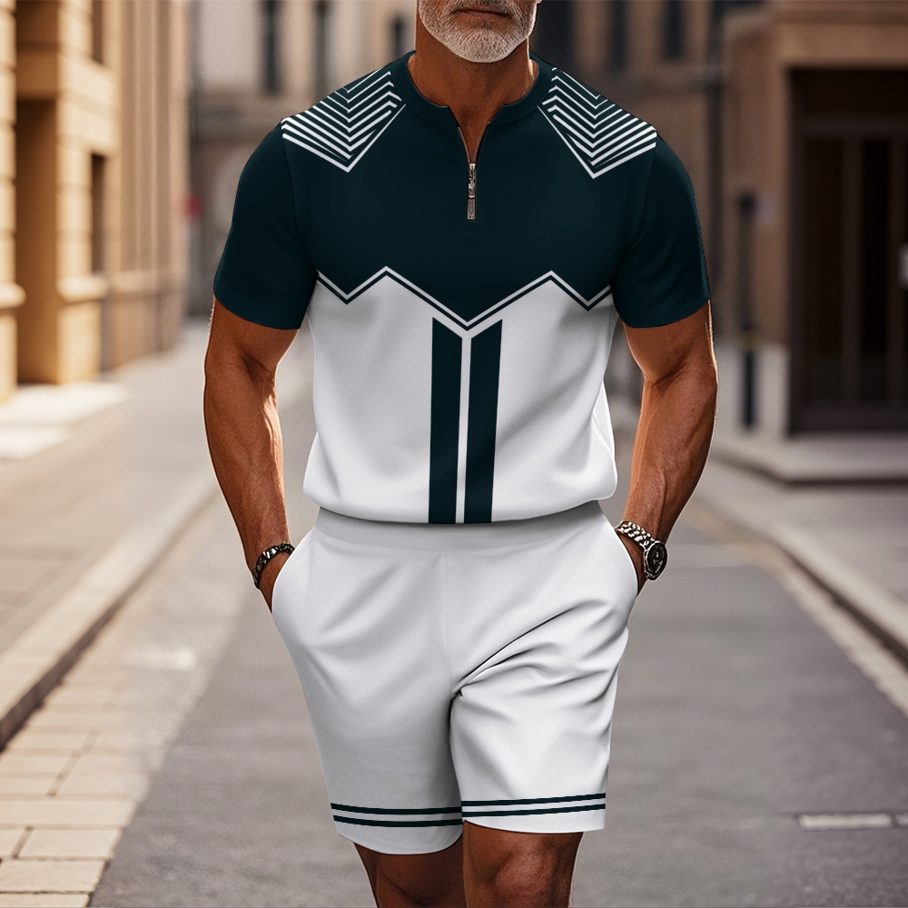 Men's fashion casual round-neck zipper geometric printed short-sleeved two-piece set 2503000108