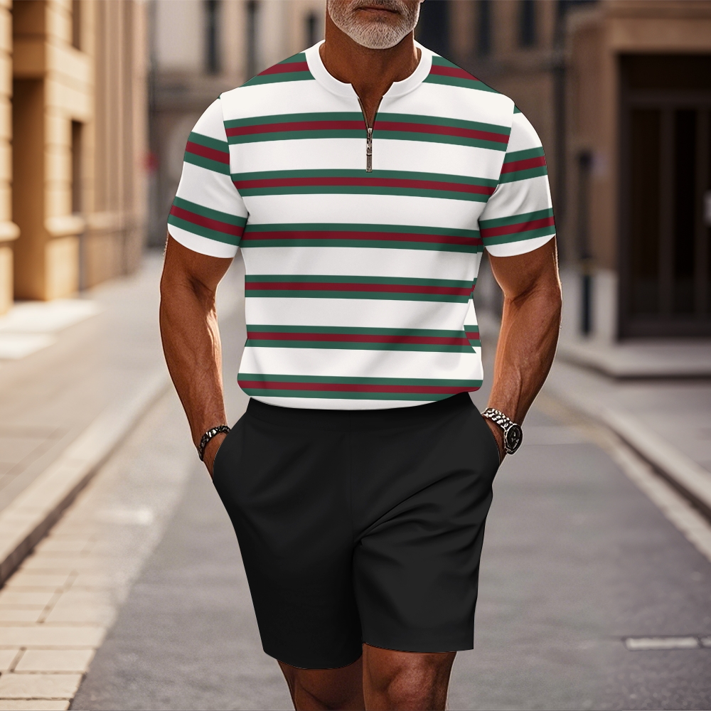 Men's fashion casual round-neck zipper geometric printed short-sleeved two-piece set 2505000384