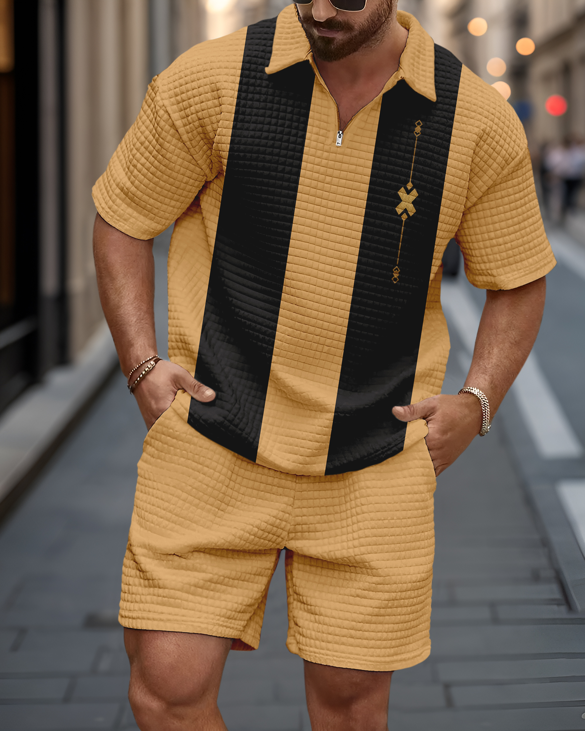 Men's Casual Art Print Waffle Texture Summer Polo Set 066