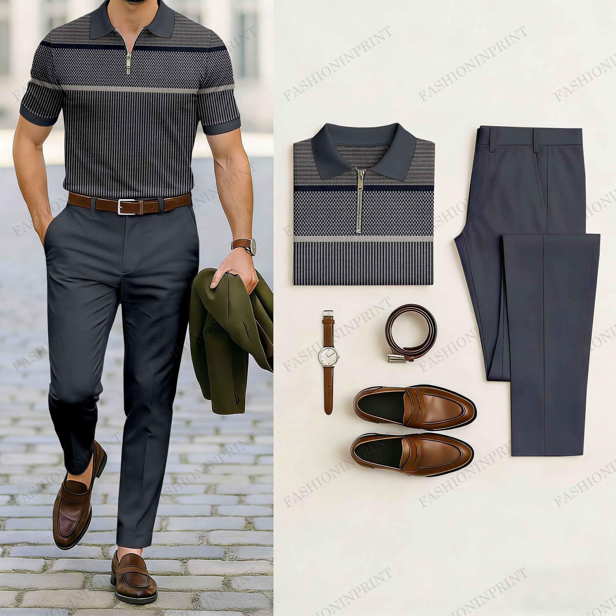 Men's Casual Black Stripes Printed Polo Shirt And Trousers Two-Piece Set