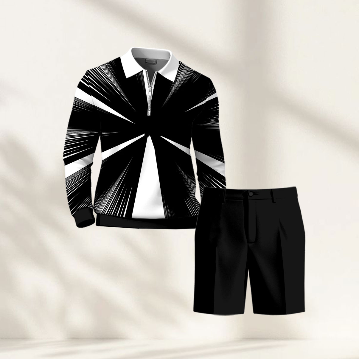 Men's Casual Black & White Color Matching Printed Zipper Long Sleeved Polo Shirt & Five-Point Pants Two-Piece Set