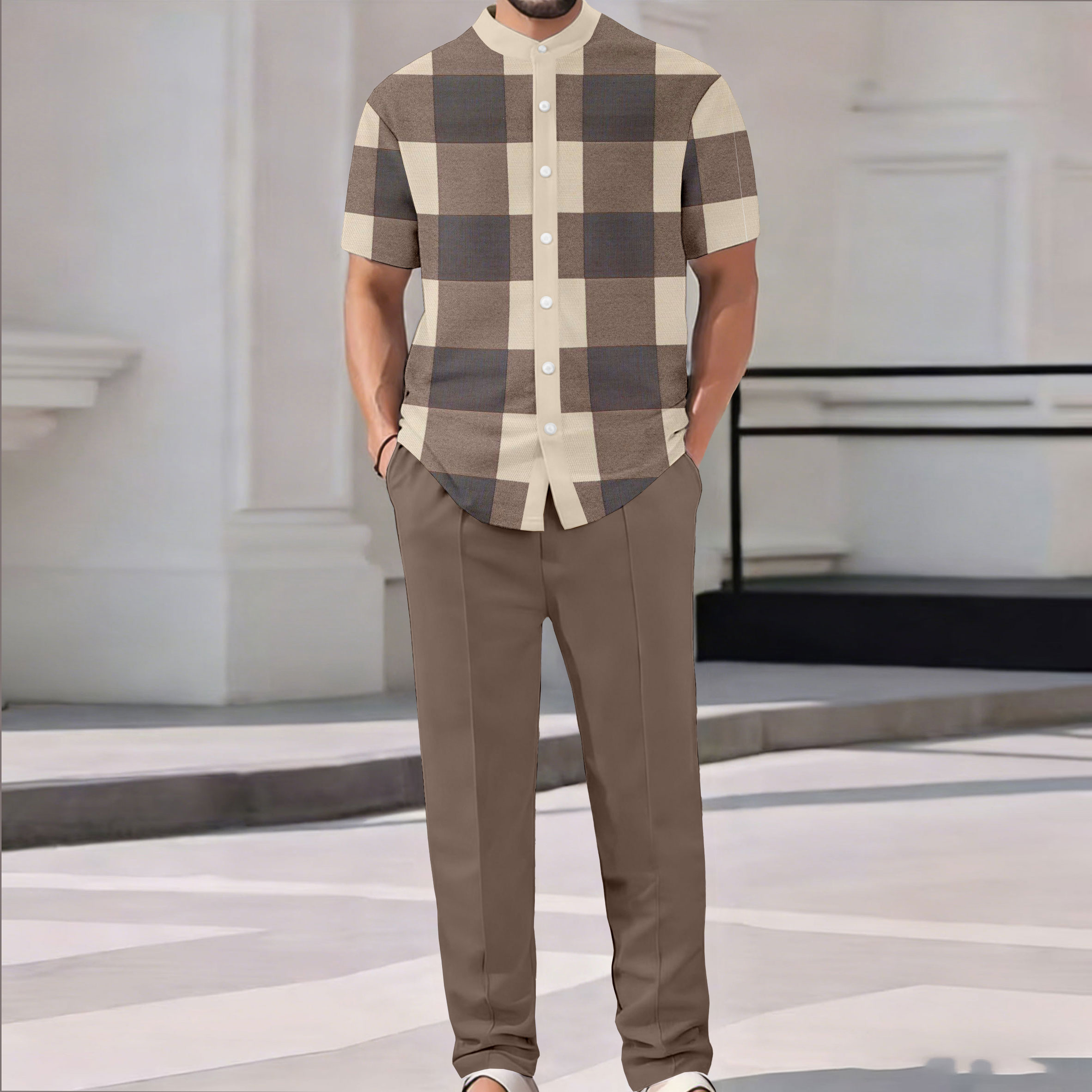 Men's Casual Coffee & Khaki Color Matching Checkered Printed Short Sleeved Shirt & Trousers Two-Piece Set