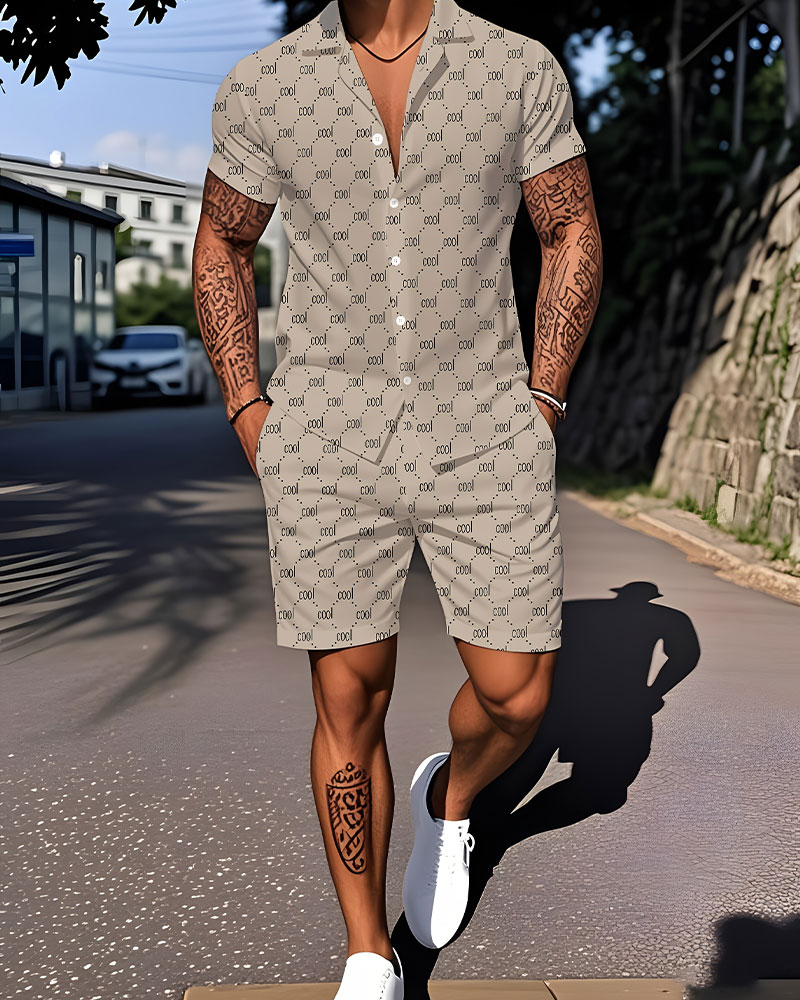 Men's Casual Khaki Color Matching Retro Style Printed Short Sleeved Shirt & Shorts Two Piece Set