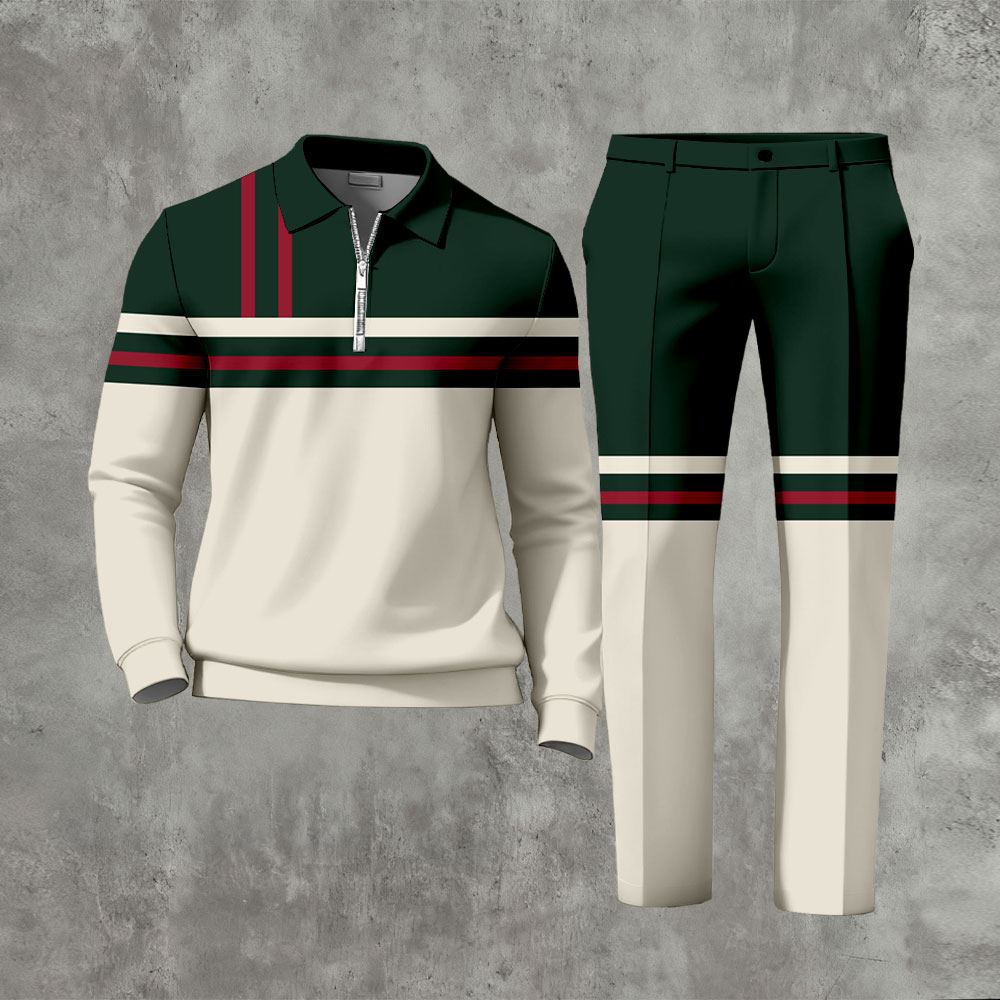 Men's Casual Green & Beige Color Matching Geometric Printed Zipper Long Sleeved Polo Shirt & Trousers Two-Piece Set