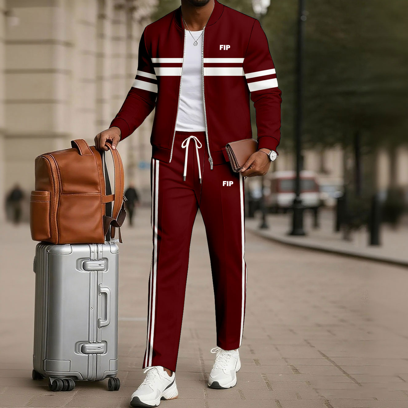 Men's Casual Color Matching White Striped Printed Round Neck Long Sleeved Jacket & Trousers Maroon Two-Piece Set
