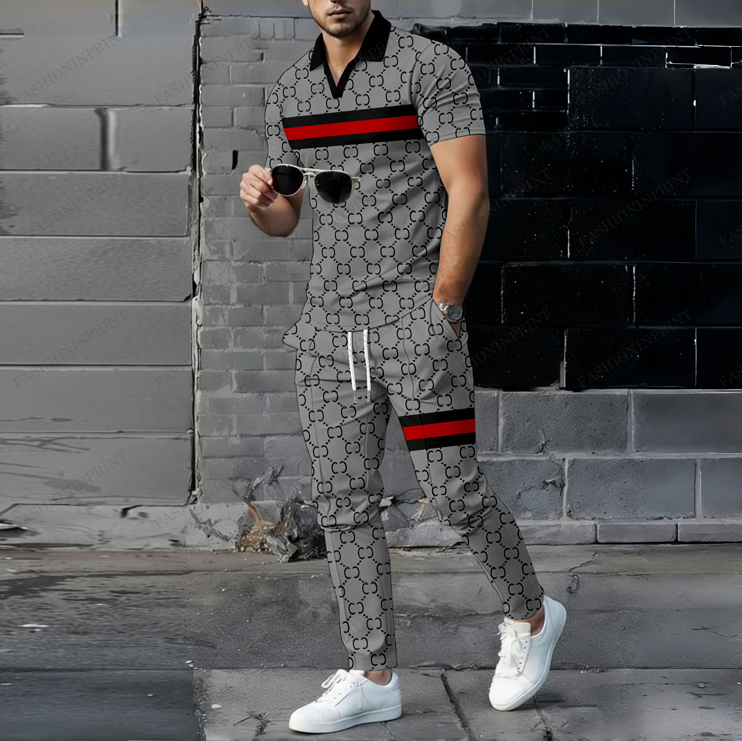 Men's Casual Gray & Black Color Matching Retro Style Printed Short Sleeved Polo Shirt & Trousers Two-Piece Set