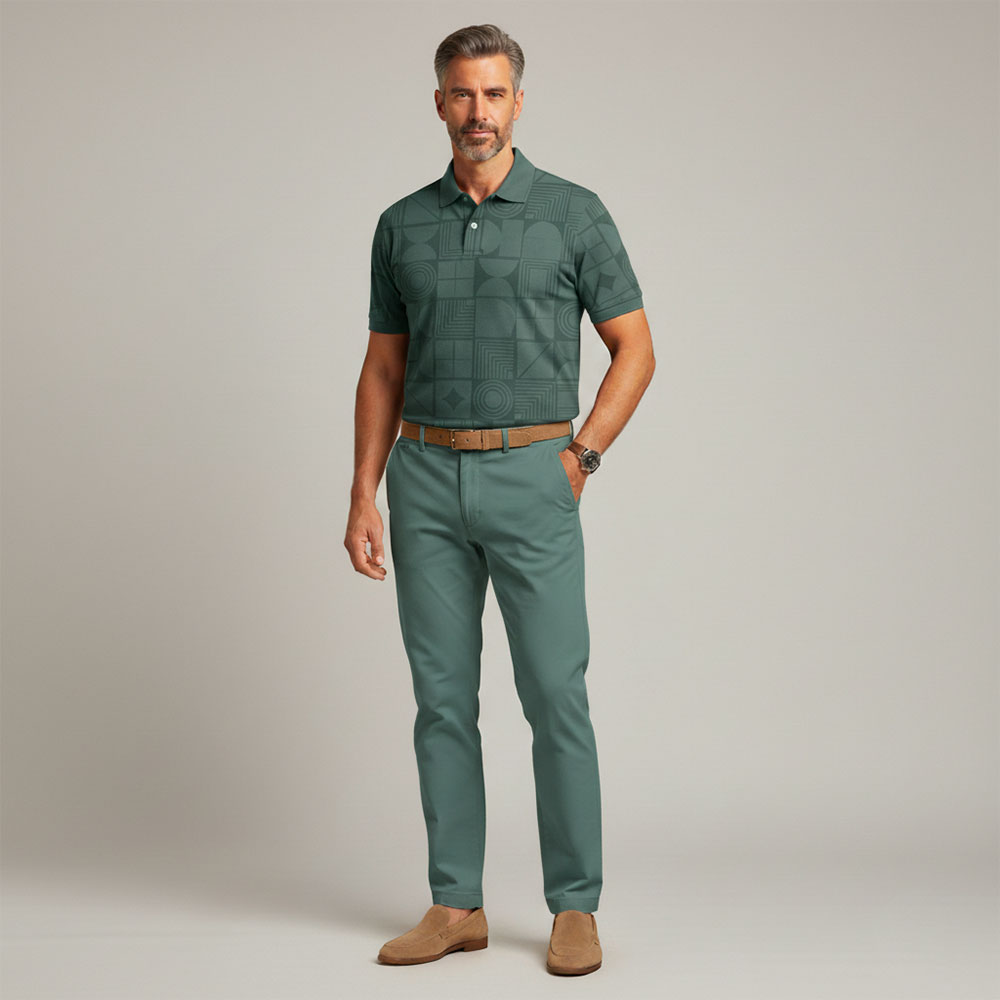 Men's Casual Green Color Matching Geometric Printed Short Sleeved Polo Shirt & Trousers Two-Piece Set