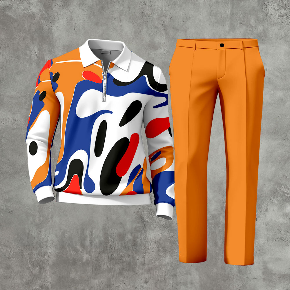 Men's Casual Orange & Multi Color Matching Printed Zipper Long Sleeved Polo Shirt & Trousers Two-Piece Set