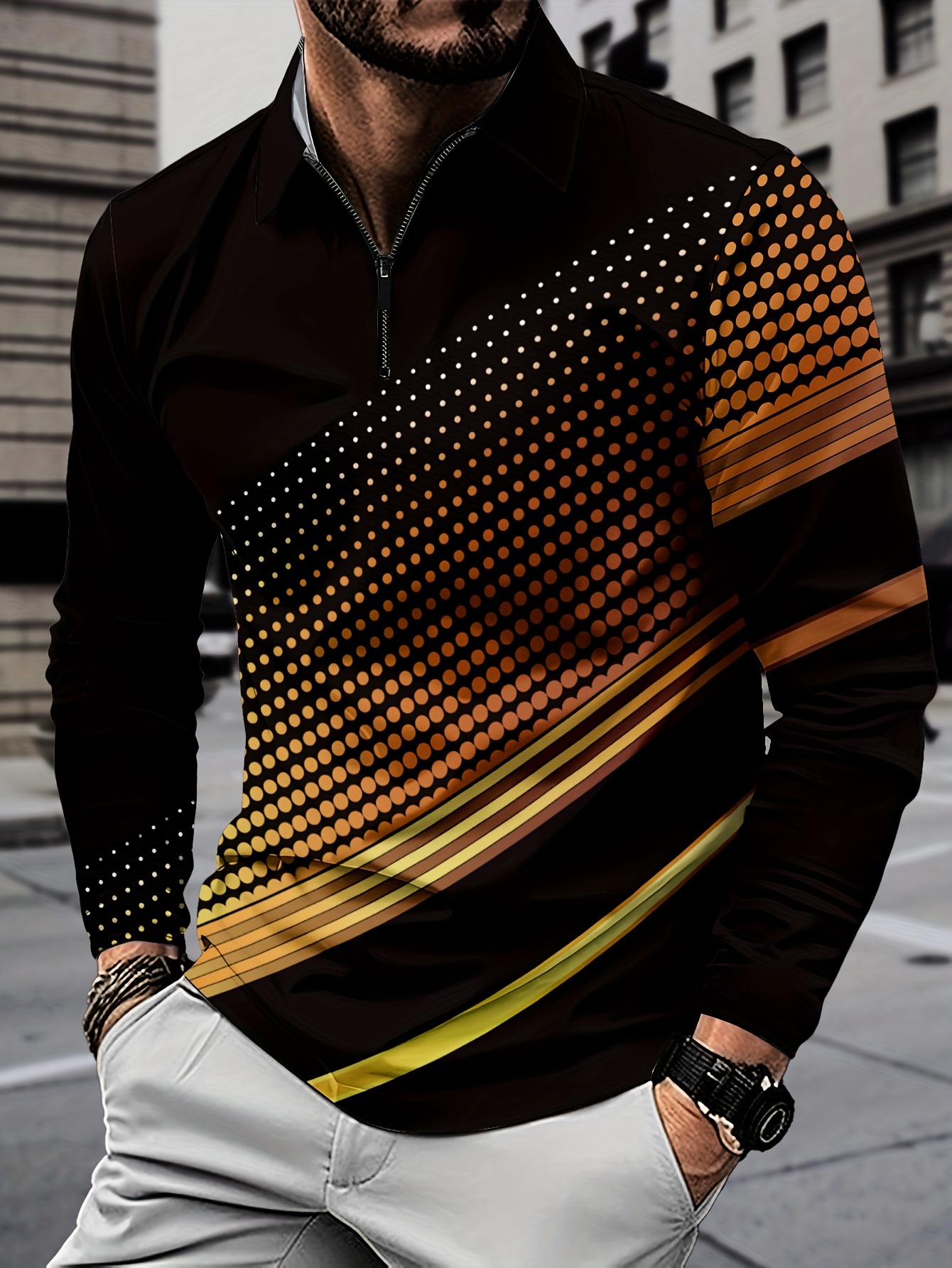Men's Casual Yellow & Black Color Matching Polka Dots Gradient Printed Zipper Long Sleeved Polo Shirt