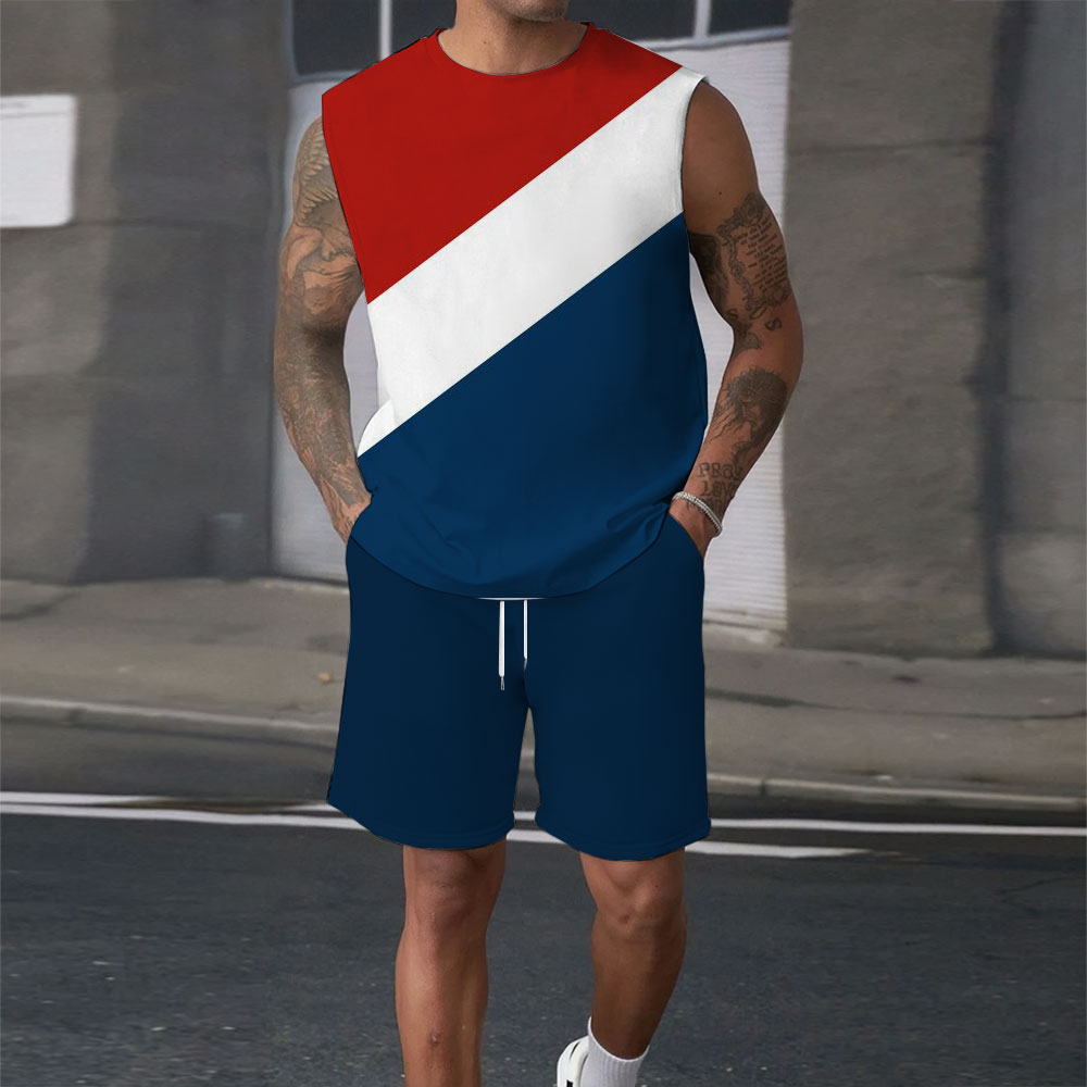 Men's Fashion Casual Color Matching Printed Sleeveless Two-Piece Set