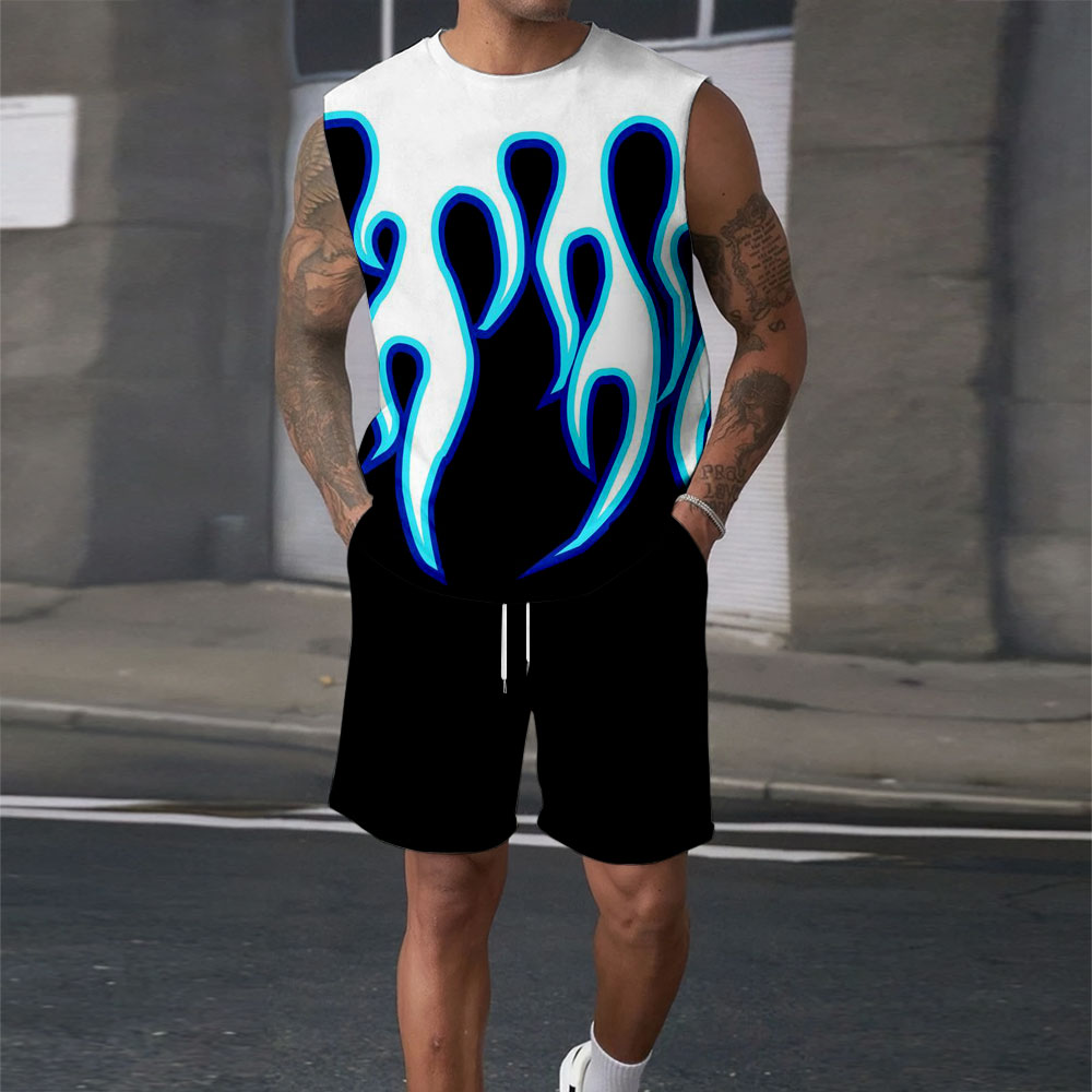 Men's Fashion Casual Color Matching Striped Printed Short Sleeved Trousers Two-Piece Set