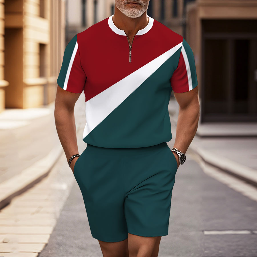 Men's Fashion Casual Red & Green Color Matching Geometric Round-Neck Zipper Short-Sleeved Two-Piece Set