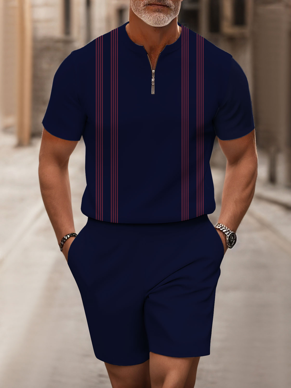 Men's Fashion Casual Round-Neck Zipper Geometric Printed Short-Sleeved Two-Piece Set