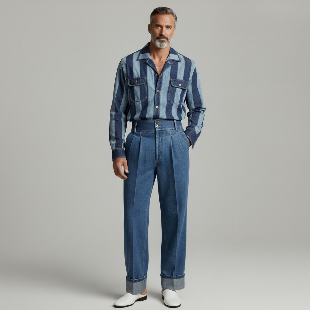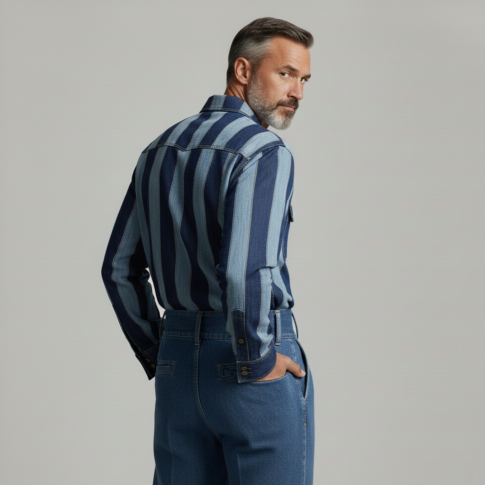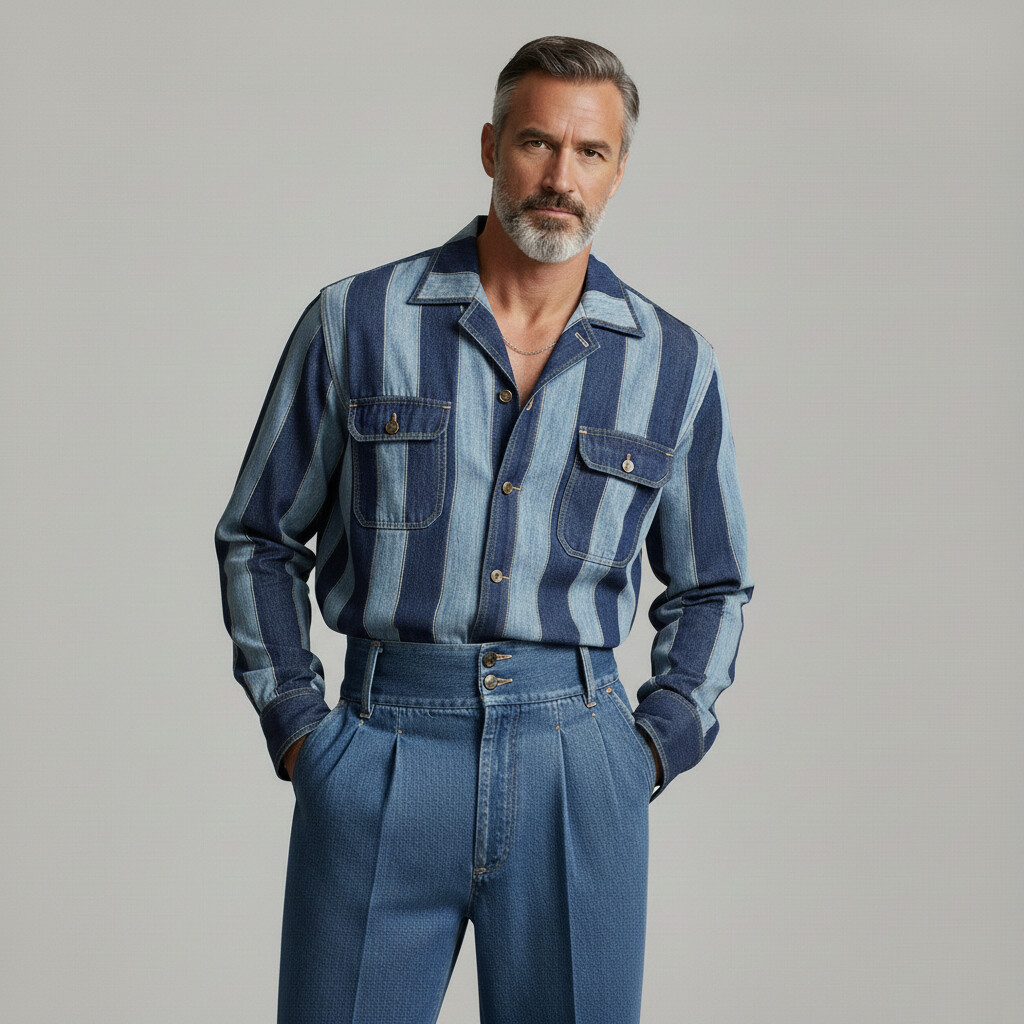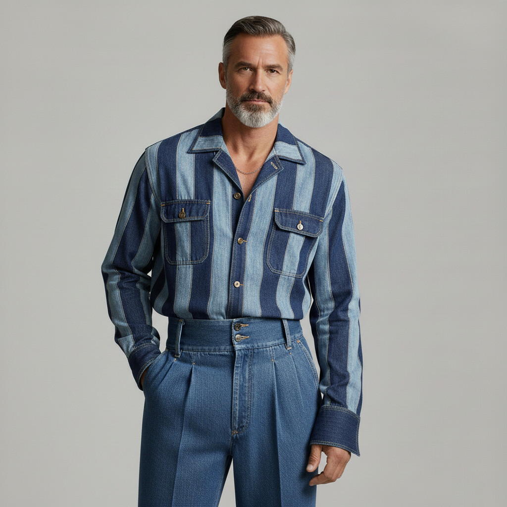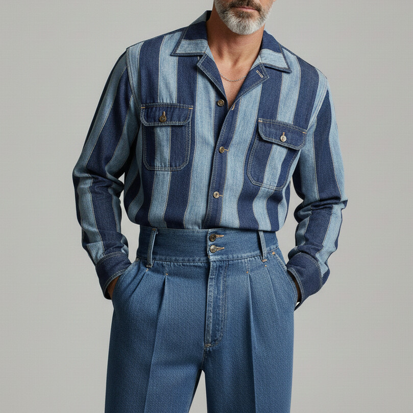 Men's Fashionable Denim Blue Contrast Striped Camp Collar Flap Pocket Long Sleeve Shirt