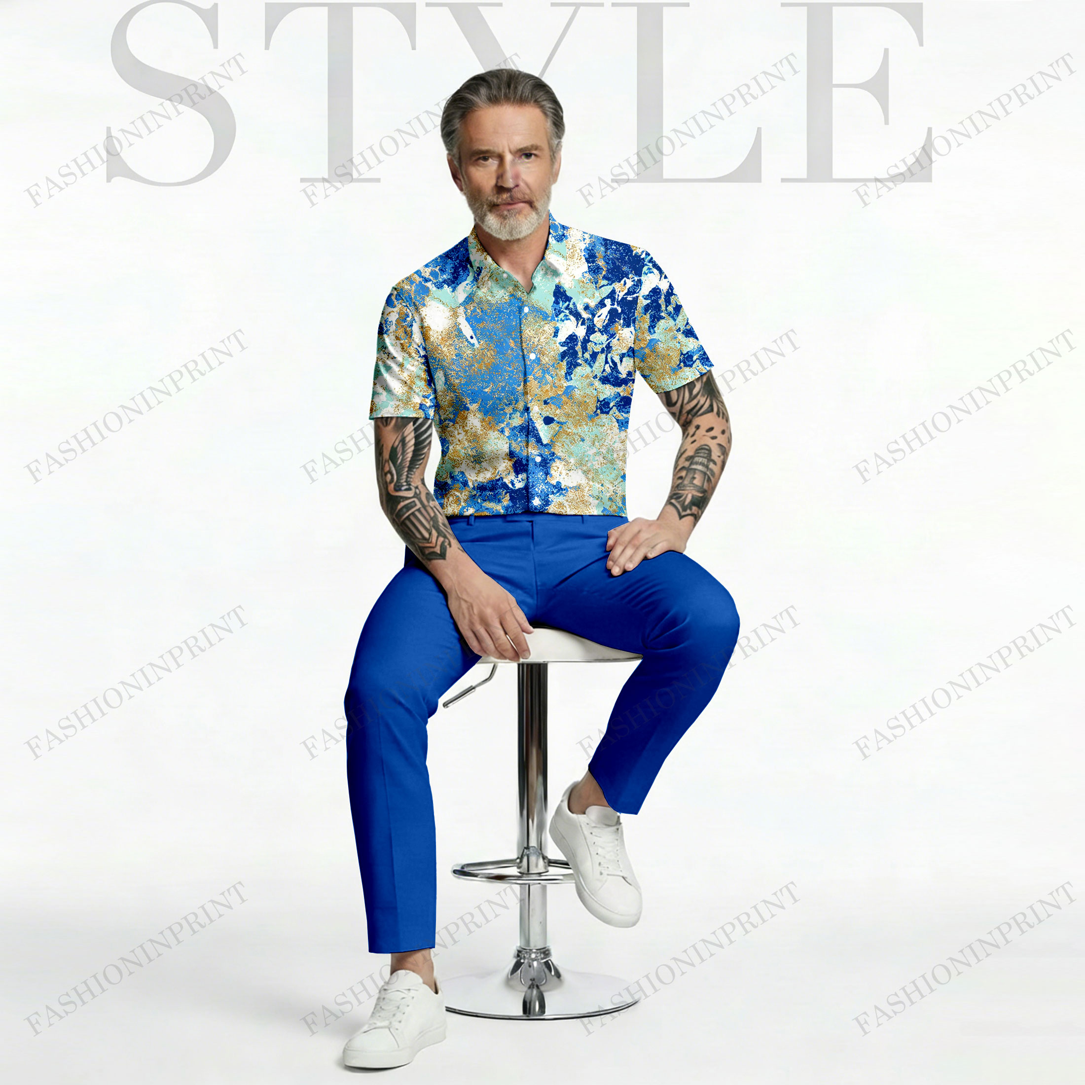 Men's Retro Dark Blue Floral Print Shirt And Trousers Two-Piece Set