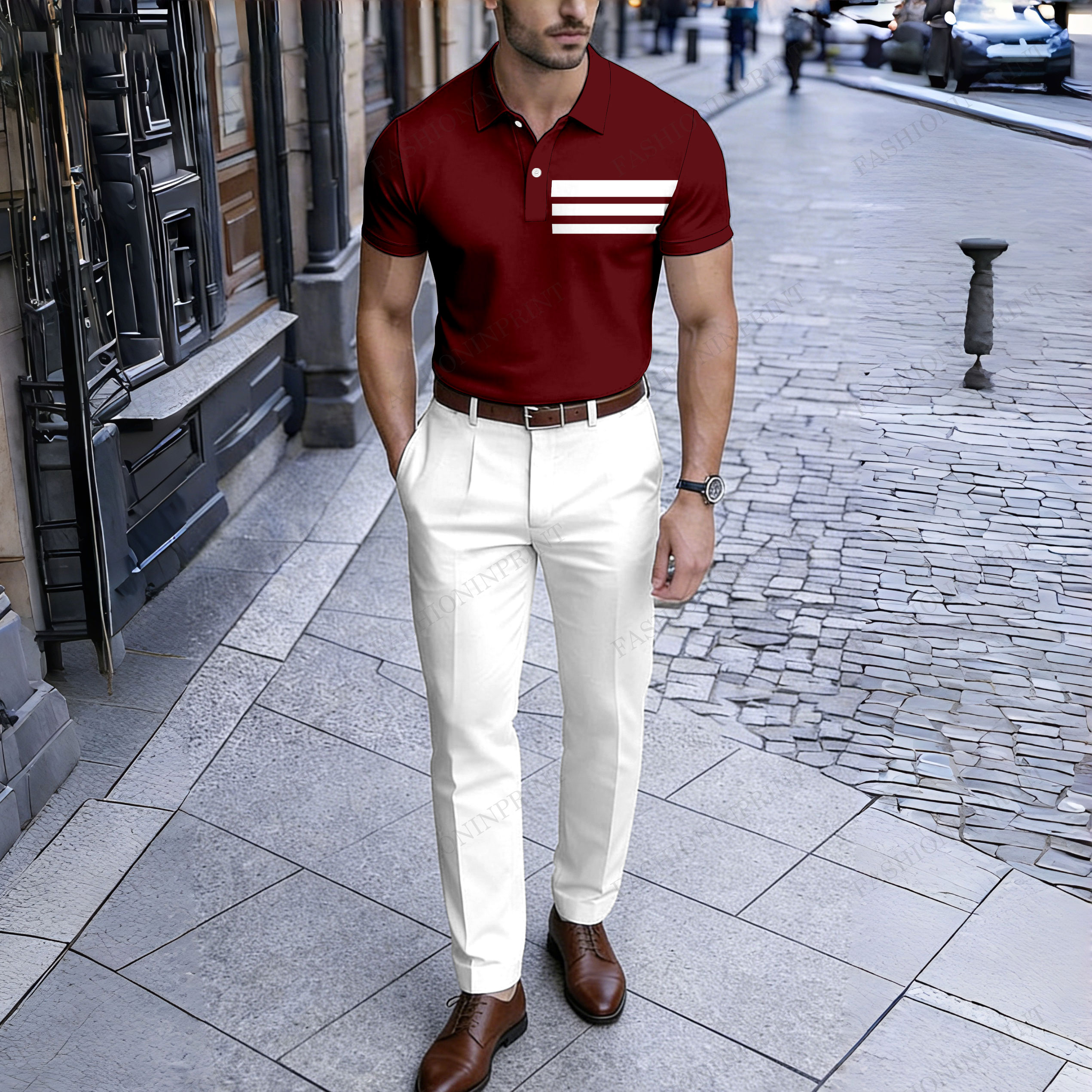 Men's Stylish Red Geometric Pattern Short-Sleeved Polo Shirt And White Trousers Two-Piece Set