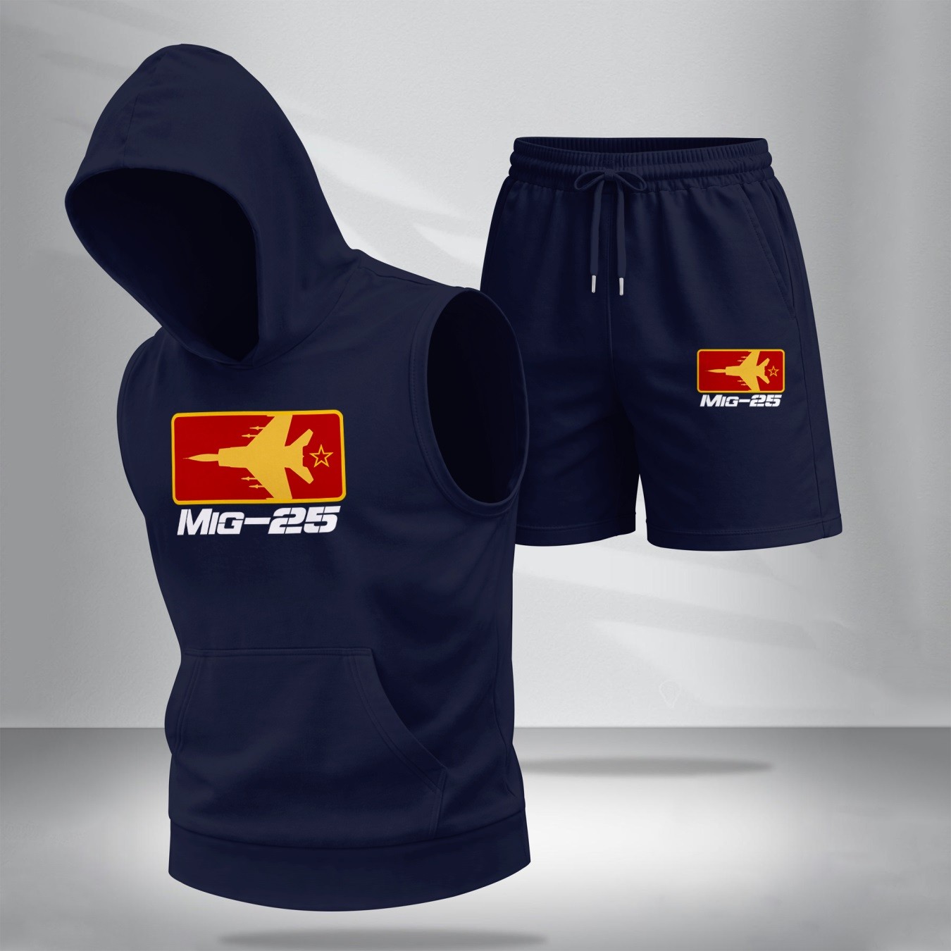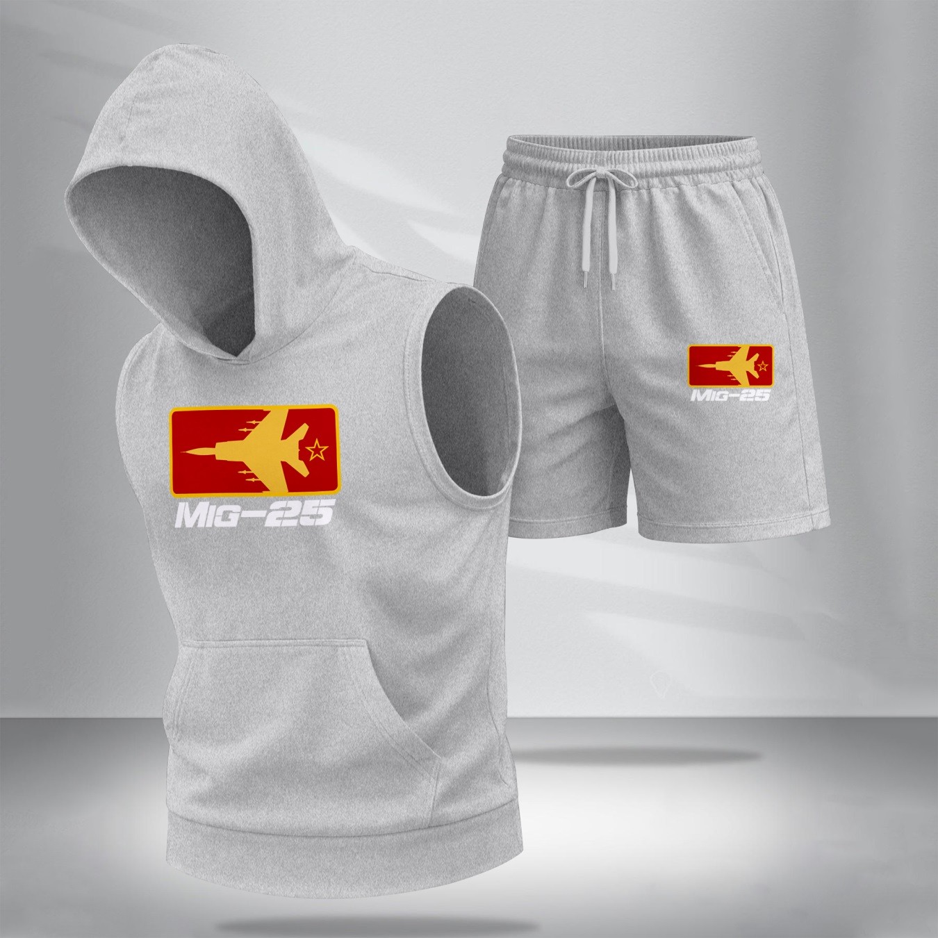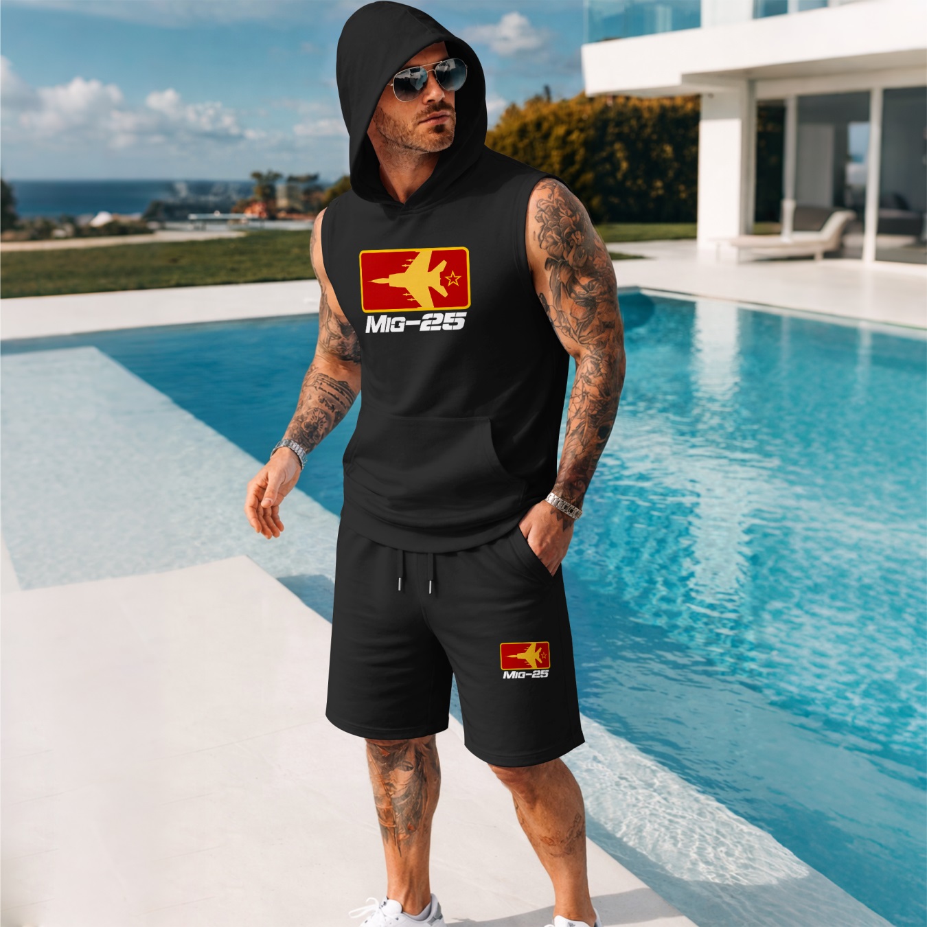 Two-Piece Men’s Summer Set – Sleeveless Hoodie & Shorts, Fighter Jet Graphic Print, Casual Streetwear, Athletic Activewear, Summer Outdoor Gym Outfit, TikTok Trending Style