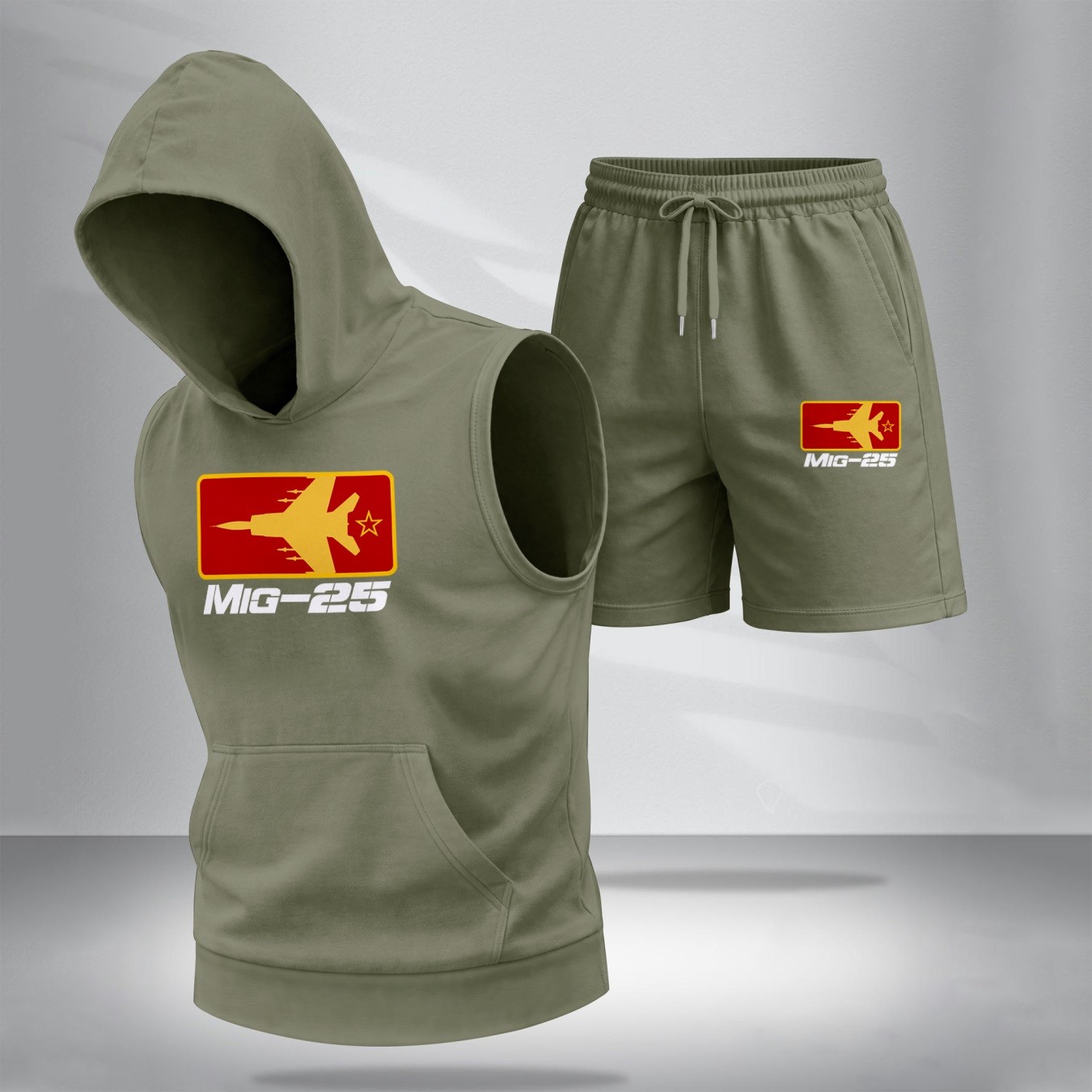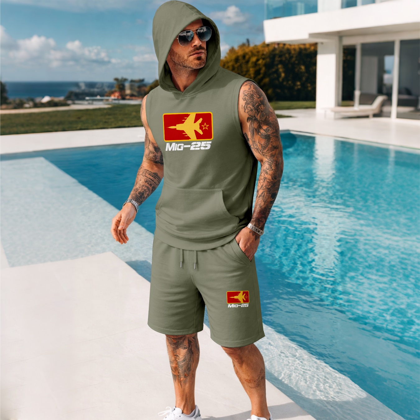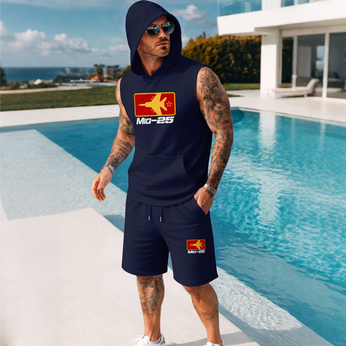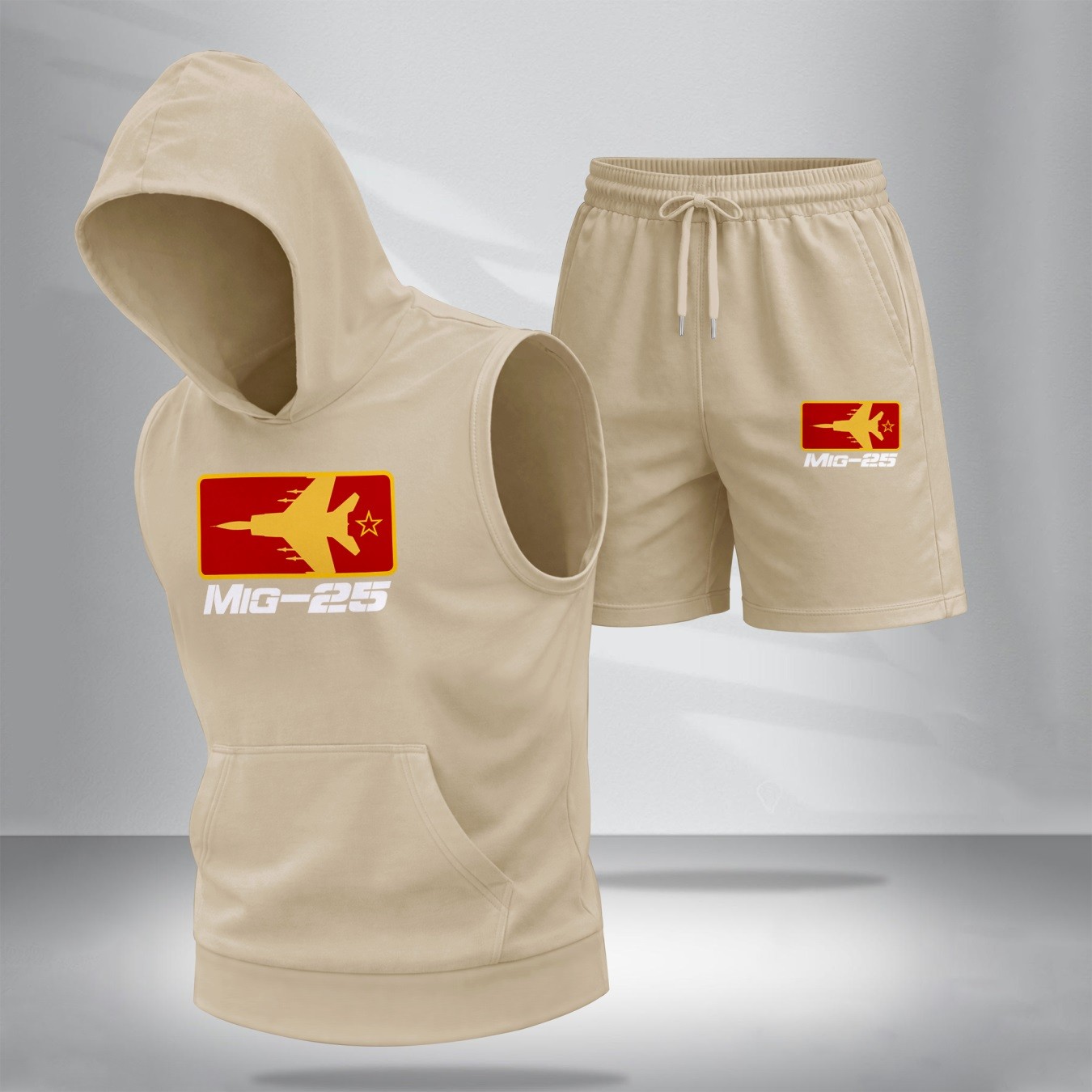 Two-Piece Men’s Summer Set – Sleeveless Hoodie & Shorts, Fighter Jet Graphic Print, Casual Streetwear, Athletic Activewear, Summer Outdoor Gym Outfit, TikTok Trending Style