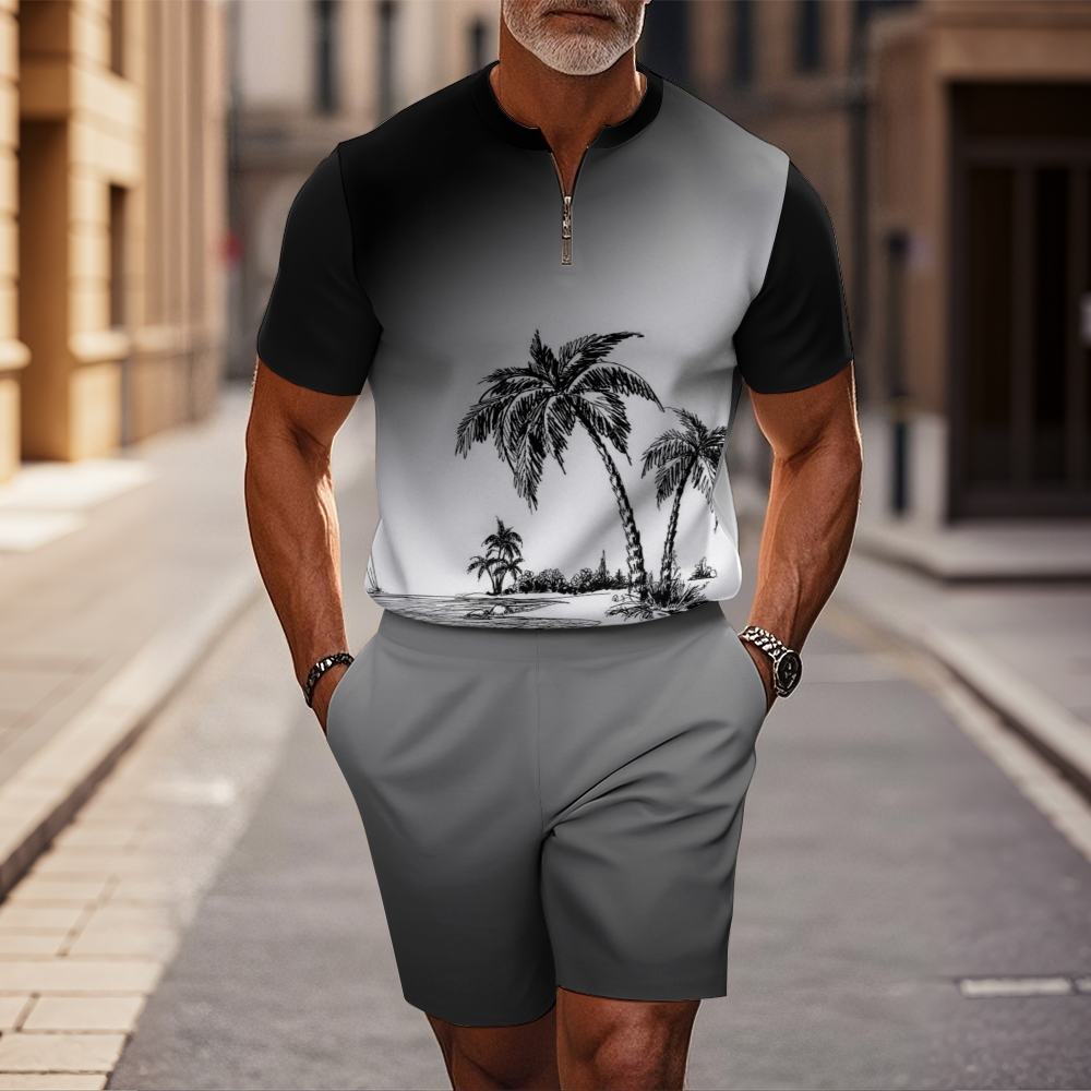 Men's fashion casual round-neck zipper geometric printed short-sleeved two-piece set 2503000135