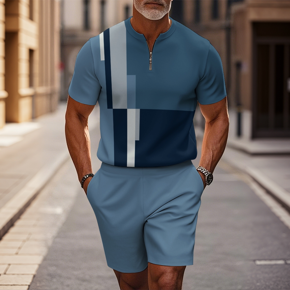 Men's fashion casual round-neck zipper geometric printed short-sleeved two-piece set 2504000067