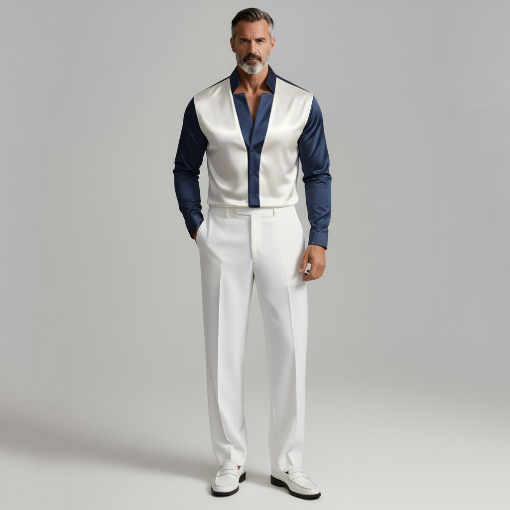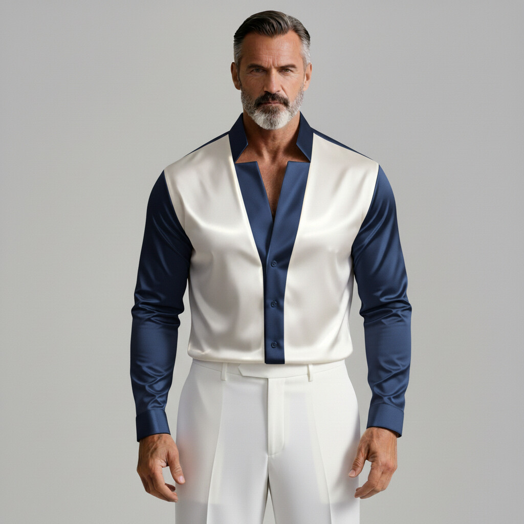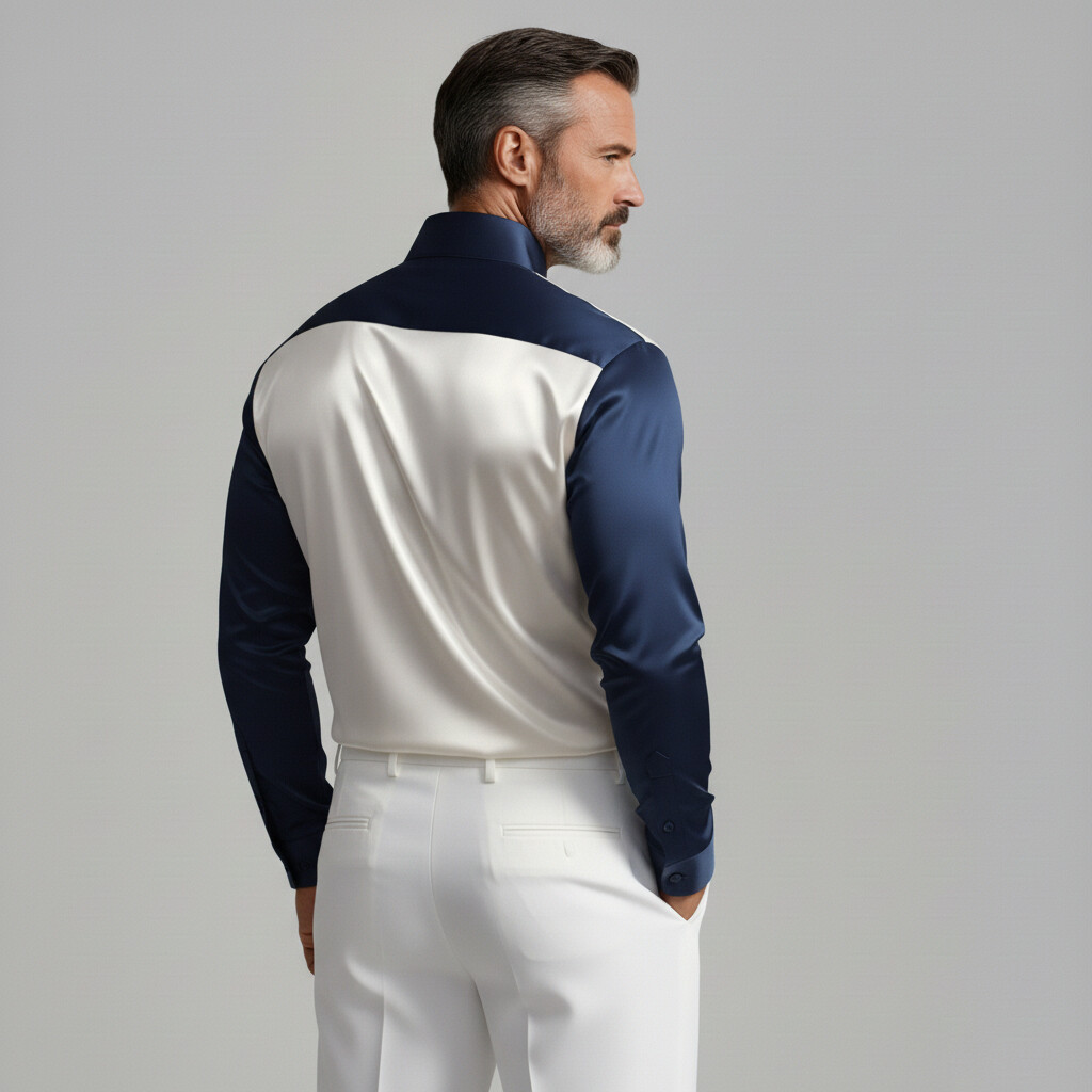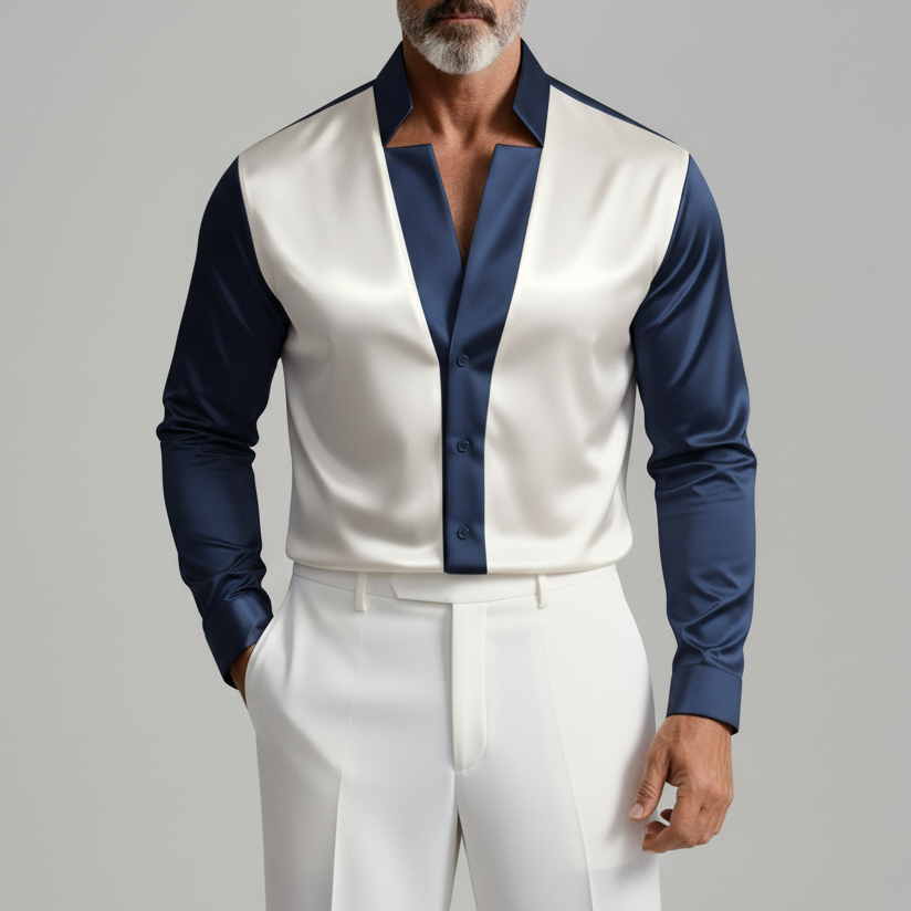 Men's Business Casual Navy Blue Contrast Color Notch Stand Collar Satin Long Sleeve Shirt