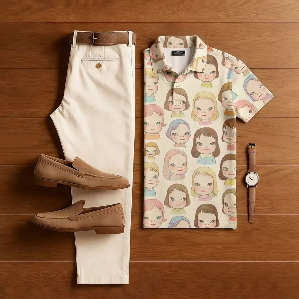 Men's Casual Apricot Doll Print Short-Sleeve Shirt And Trousers Two-Piece Set
