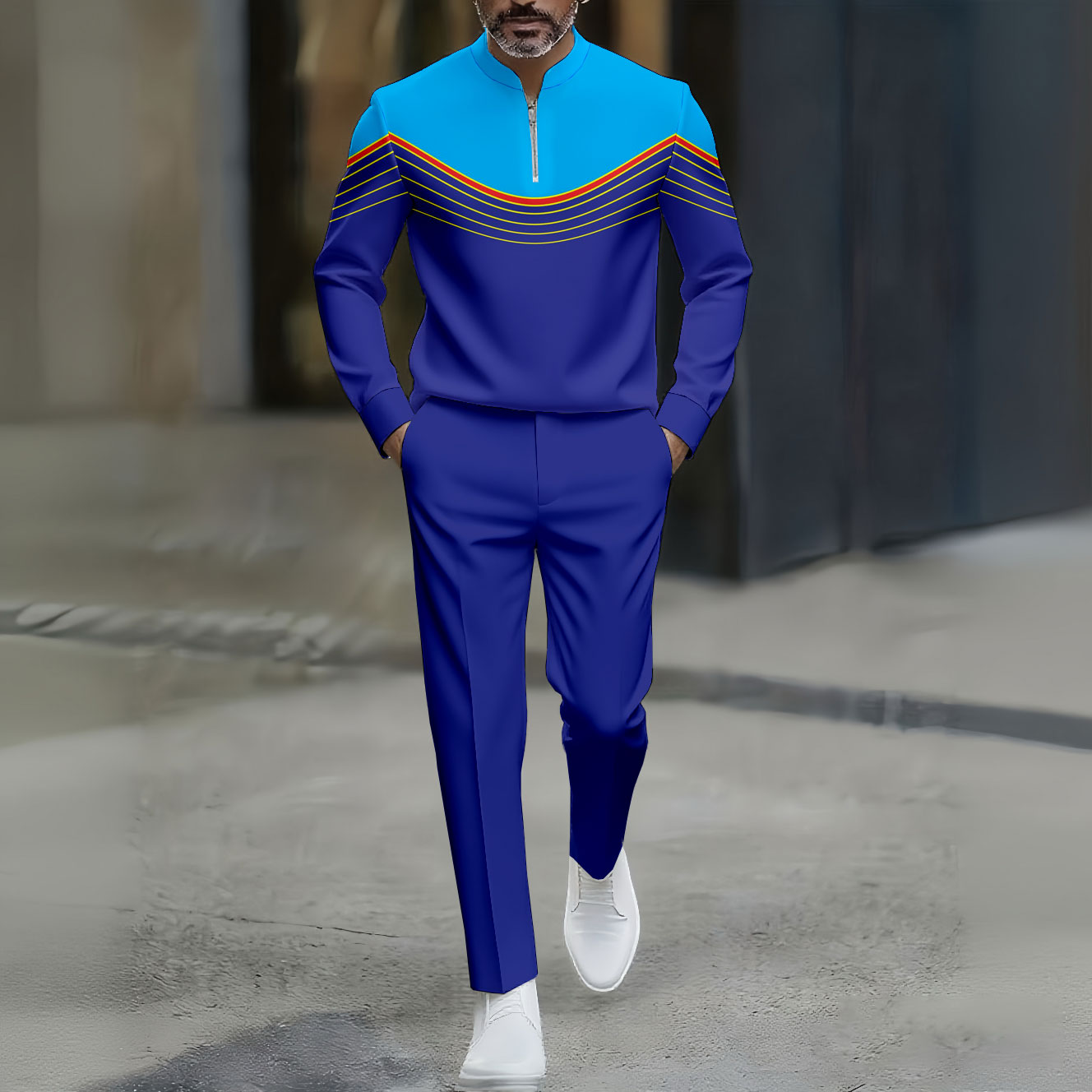 Men's Casual Bule Color Matching Striped Printed Round-Neck Zipper Long Sleeved Trousers Two-Piece Set
