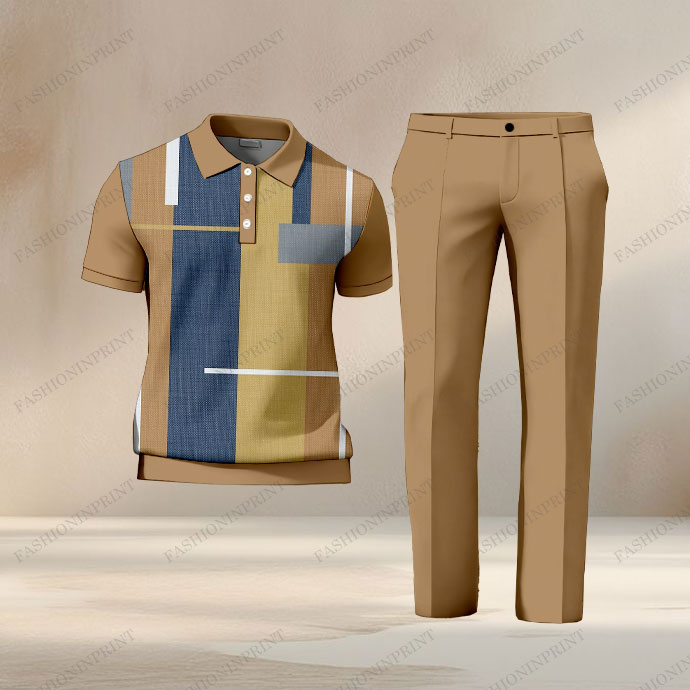Men's Casual Brown & Denim Blue Color Matching Geometric Printed Short Sleeved Polo Shirt & Trousers Two-Piece Set