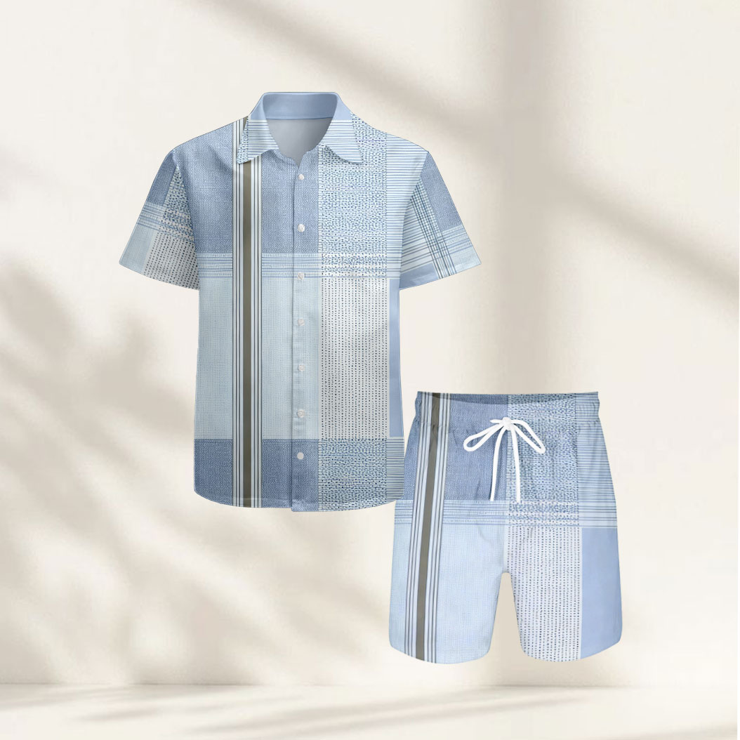 Men's Casual Multi Light Blue Color Matching Geometric Print Short-Sleeve Shirt & Shorts Two-Piece Set