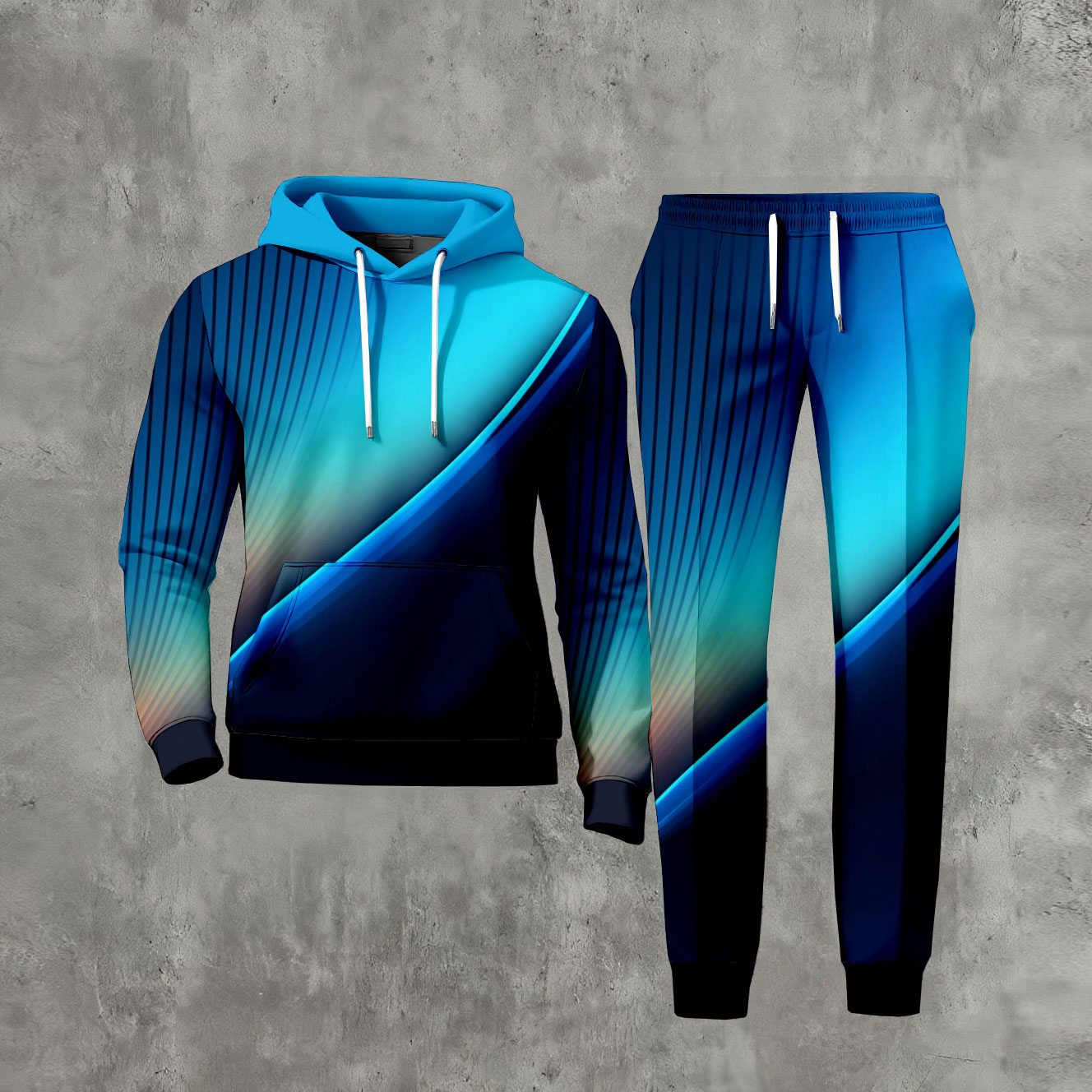 Men's Casual Blue Gradient Color Matching Printed Long-Sleeved Hoodies Sweatshirt & Trousers Two-Piece Set
