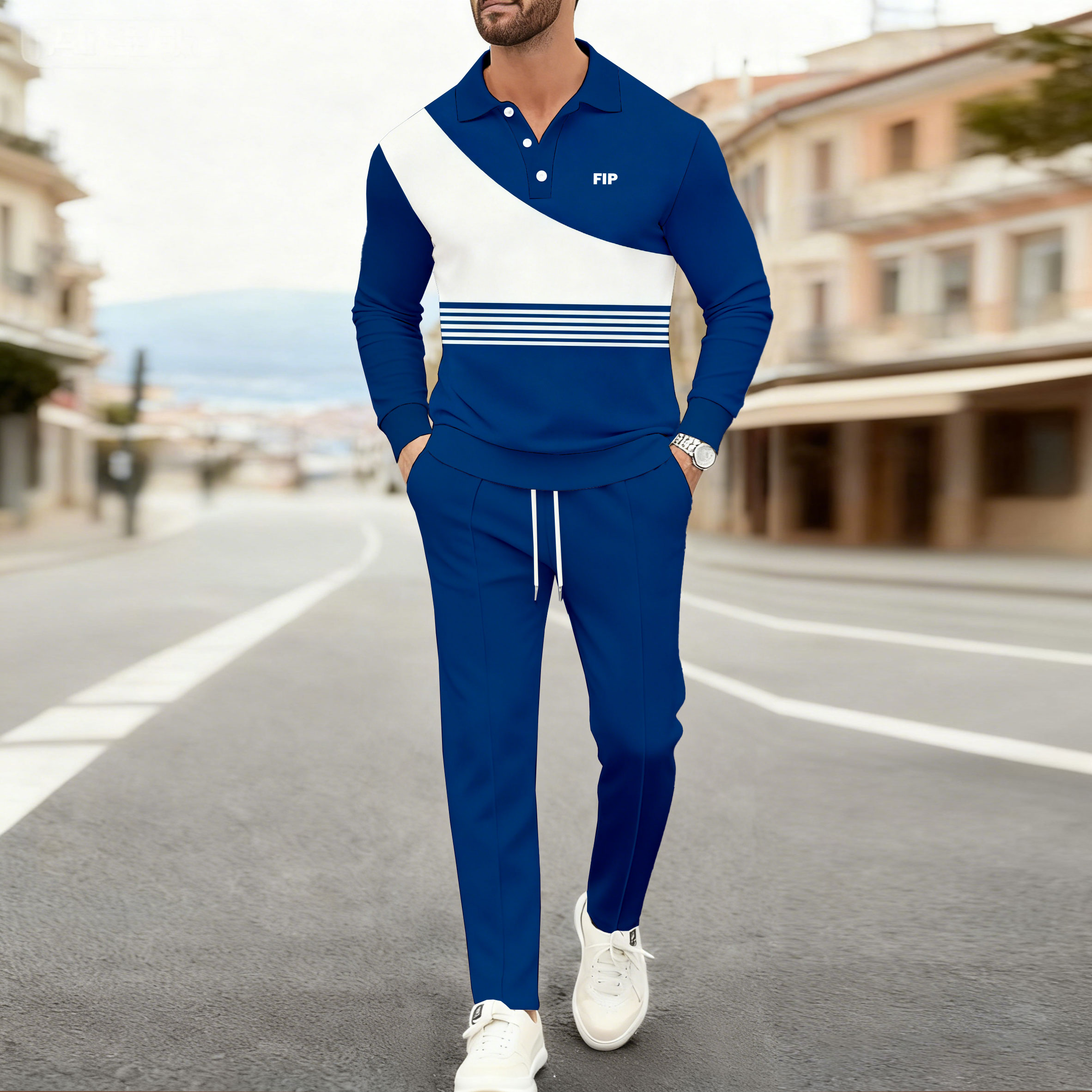 Men's Casual Color Matching Printed Polo-Collar Long Sleeved Trousers Two-Piece Set
