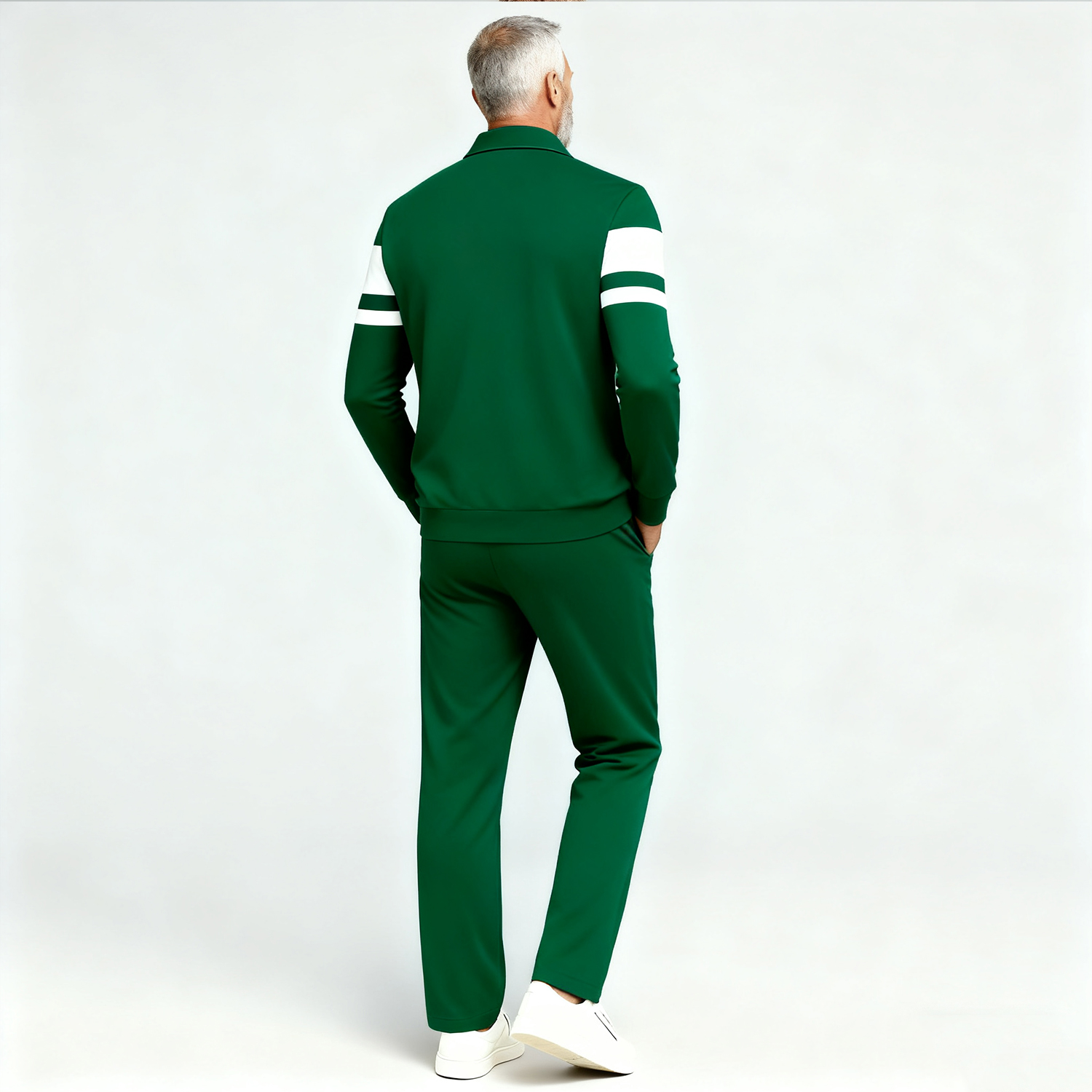 Men's Casual Green&White Color Matching Striped Printed Polo-Collar Zipper Long Sleeved Trousers Two-Piece Set