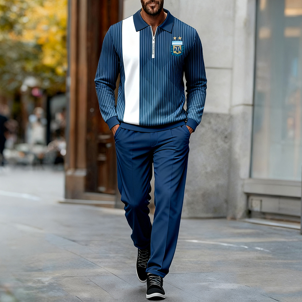 Men's Casual Color Matching Striped Printed Polo-Collar Zipper Long Sleeved Trousers Navy Blue Two-Piece Set