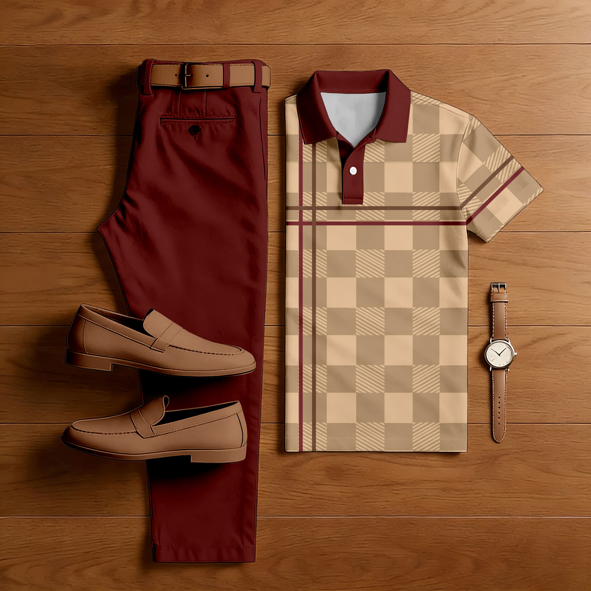 Men's Casual Maroon & Tan Color Matching Checkered Printed Short Sleeved Polo Shirt & Trousers Two-Piece Set