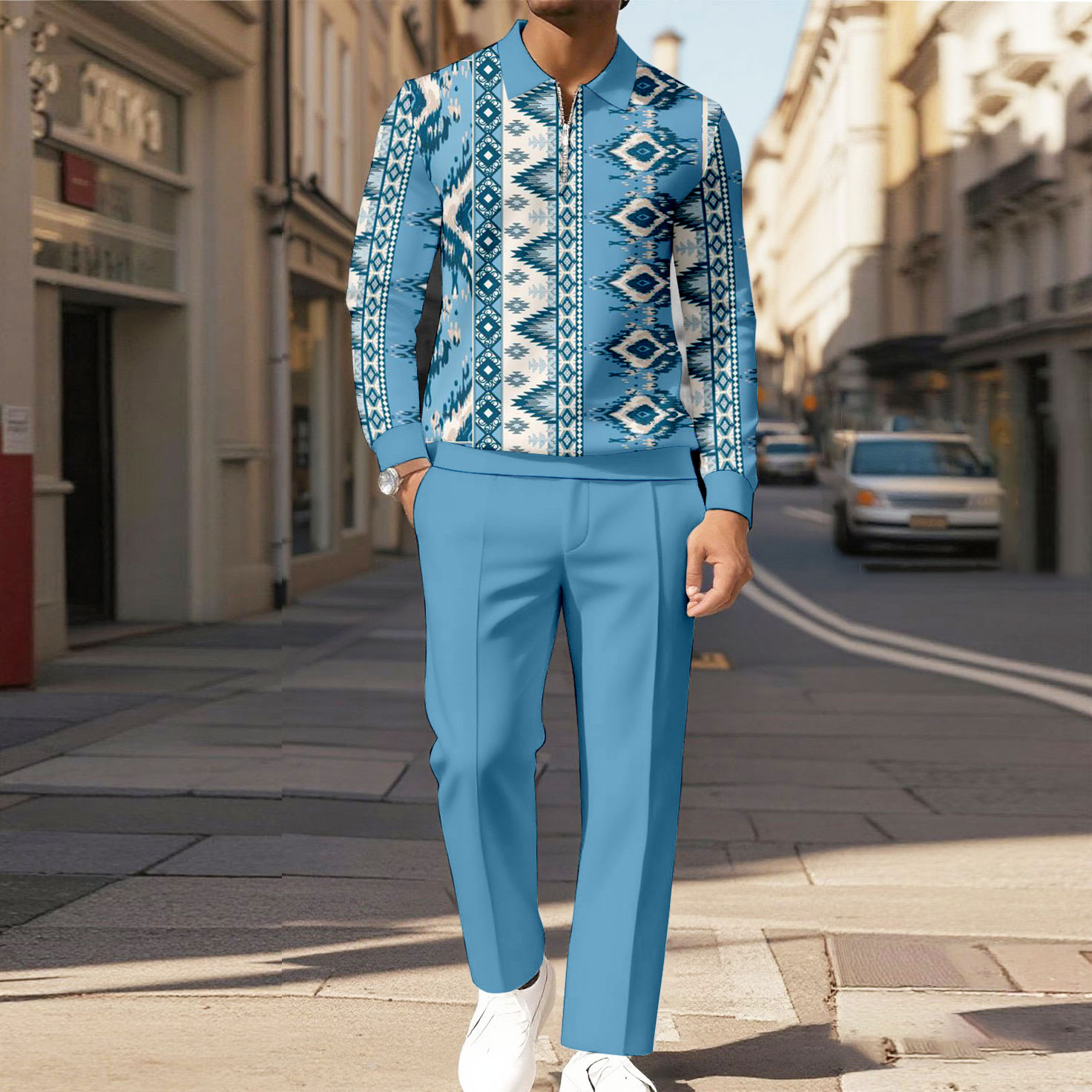Men's Casual Blue Color Matching Ethnic Style Printed Zipper Long Sleeved Polo Shirt & Trousers Two-Piece Set