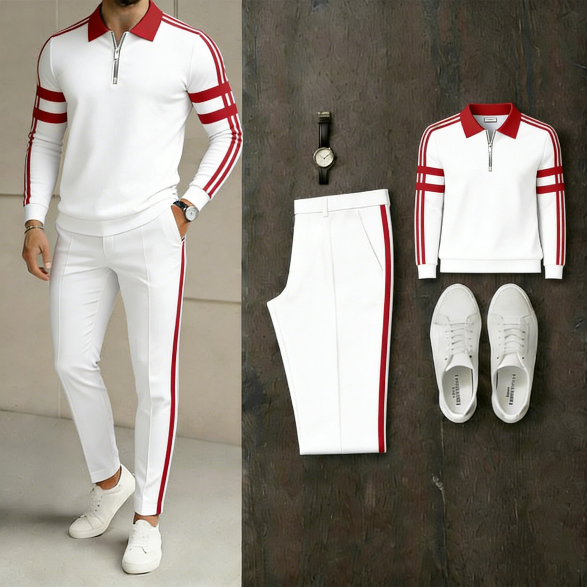 Men's Casual White & Red Color Matching Striped Printed Zipper Long Sleeved Polo Shirt & Trousers & Watch Three-Piece Set