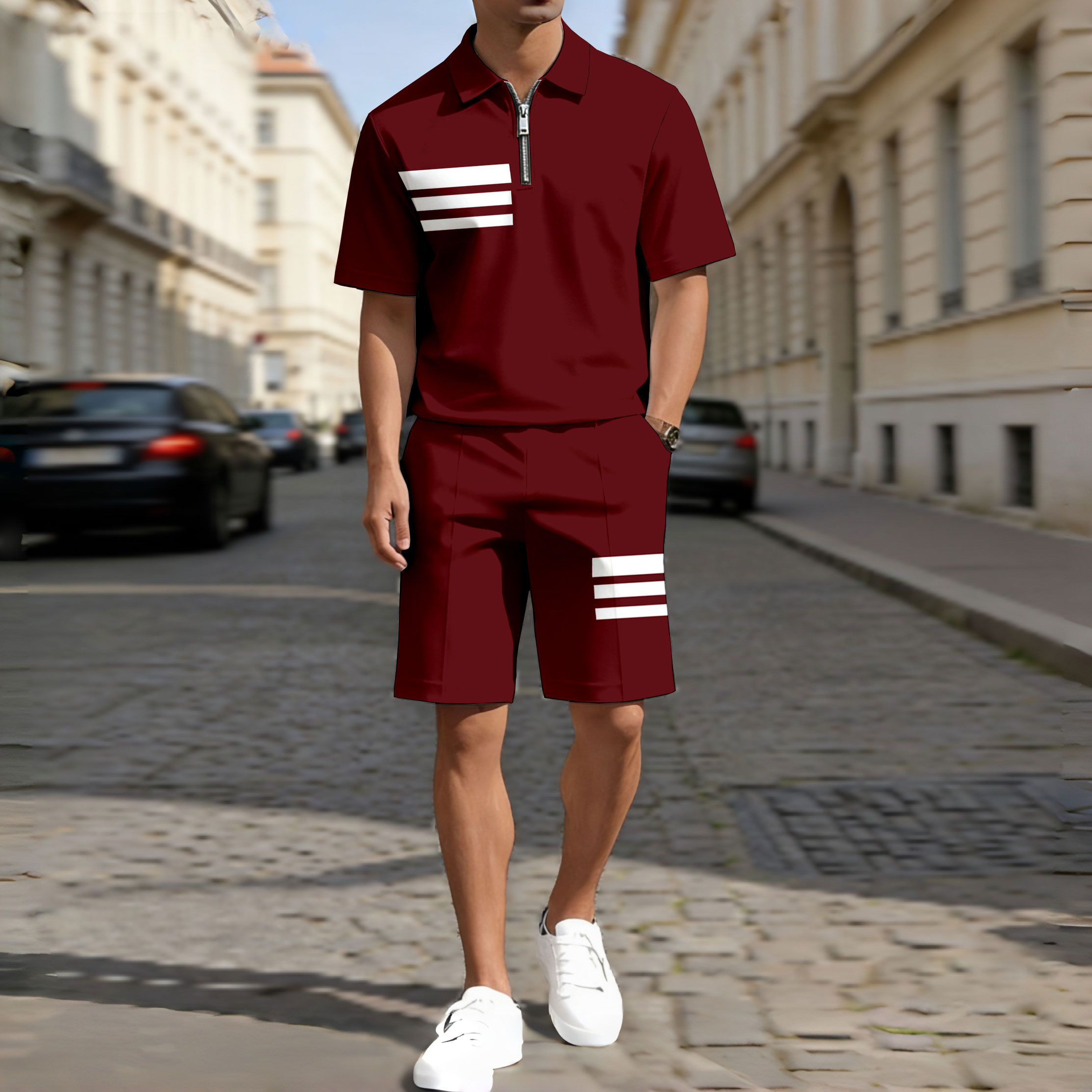 Men's Casual Maroon & White Color Matching Striped Printed Zipper Short Sleeved Polo Shirt & Five-Point Pants Two-Piece Set