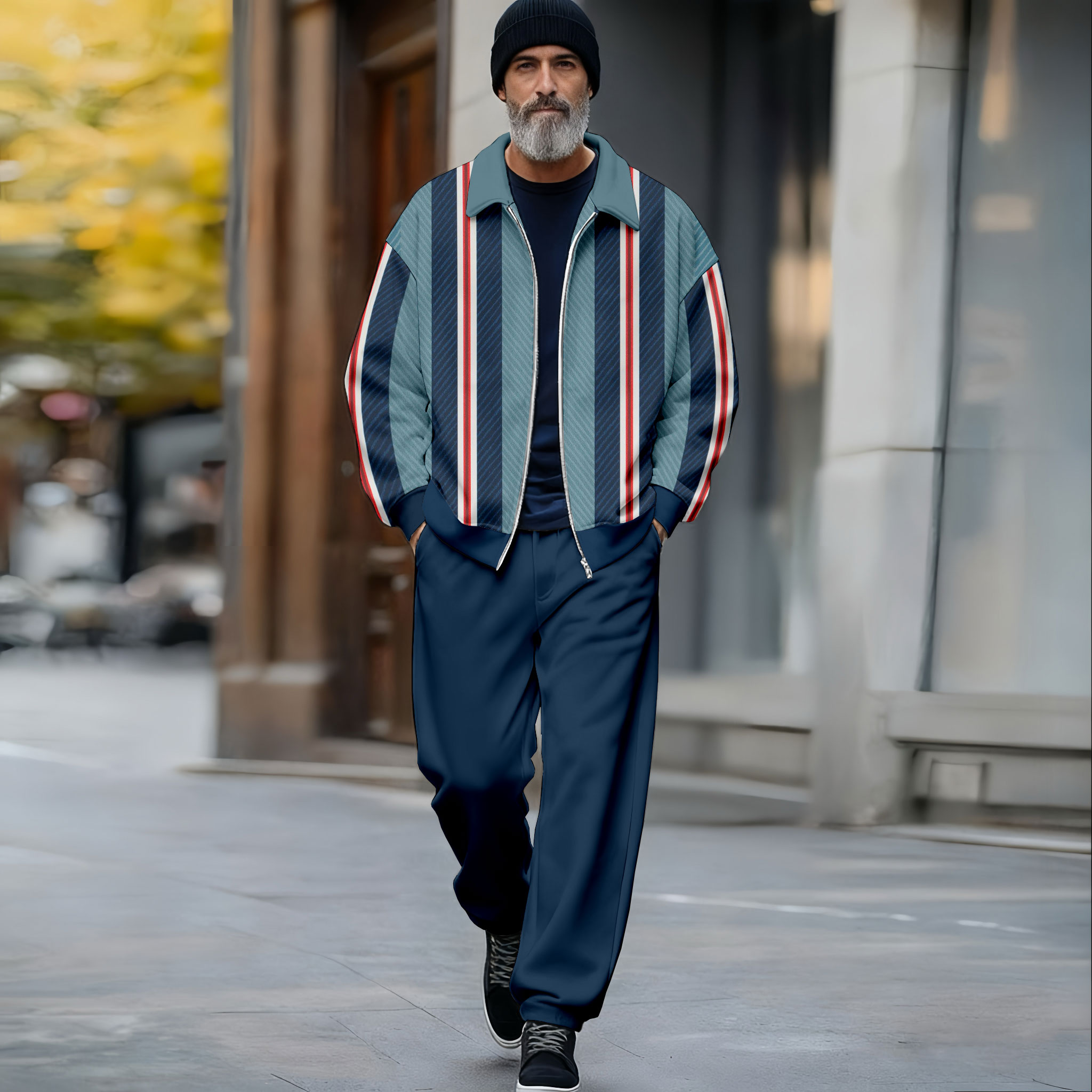 Men's Casual Color Matching Striped Printed Lapel-Collar Long Sleeved Trousers Navy Blue Two-Piece Set