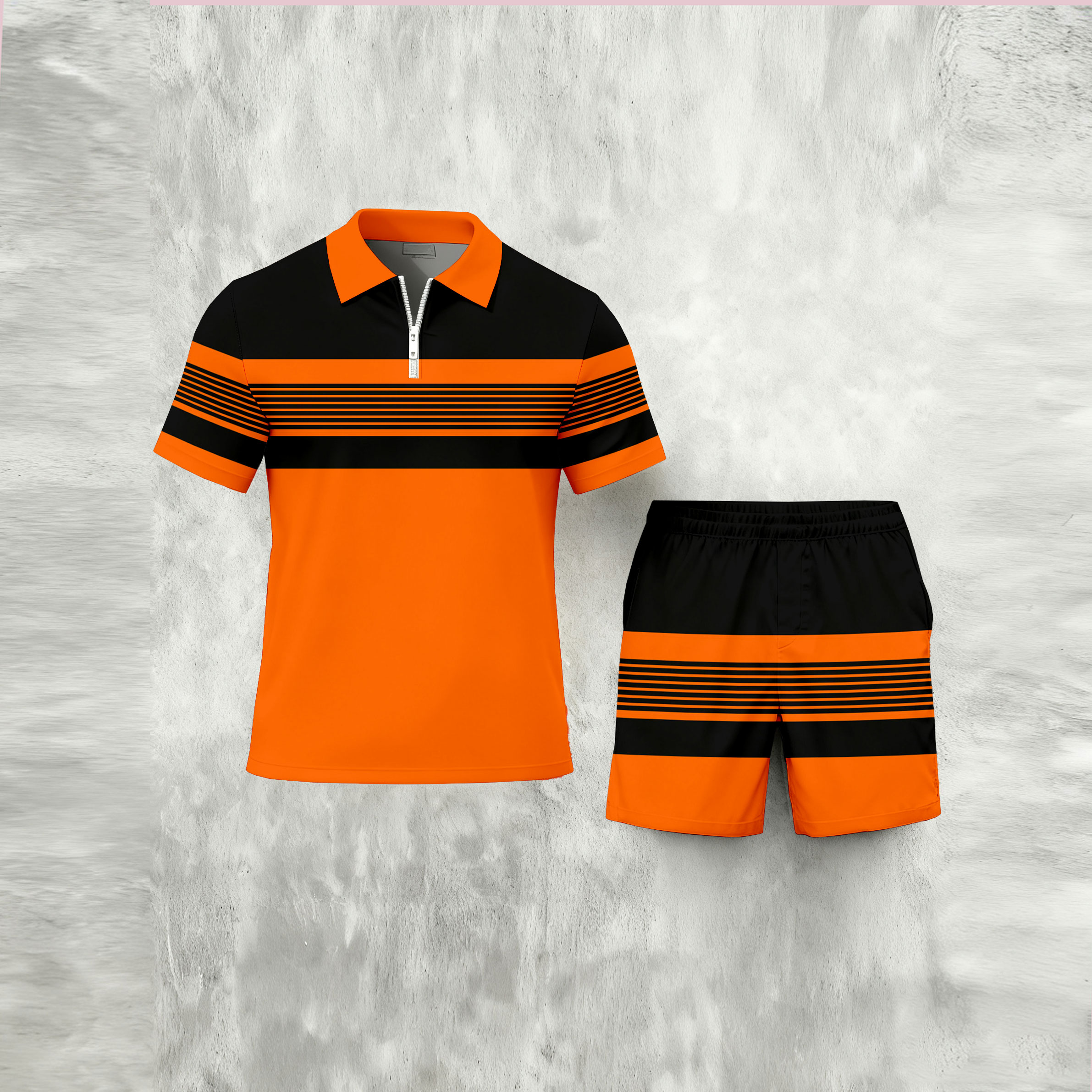 Men's Casual Orange & Black Color Matching Striped Print Zipper Short-Sleeve Polo Shirt & Shorts Two-Piece Set