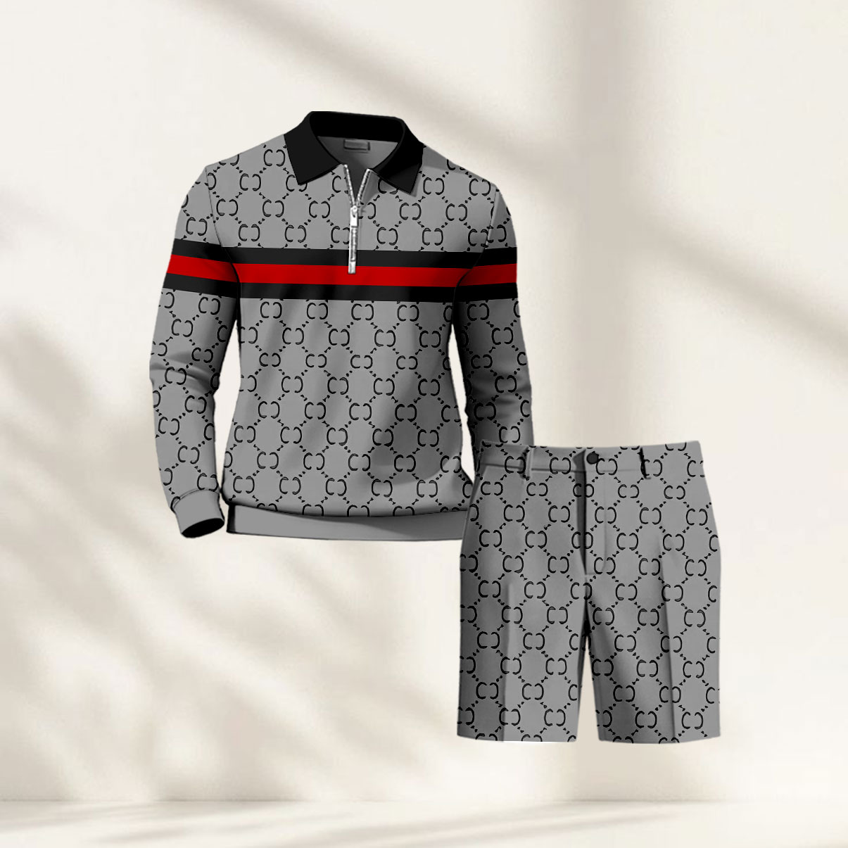 Men's Casual Gray & Black Color Matching Vintage Pattern Zipper Long Sleeved Polo Shirt & Five-Point Pants Two-Piece Set