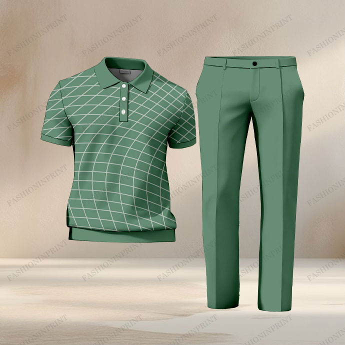 Men's Casual Green Color Matching Checkered Printed Short Sleeved Polo Shirt & Trousers Two-Piece Set