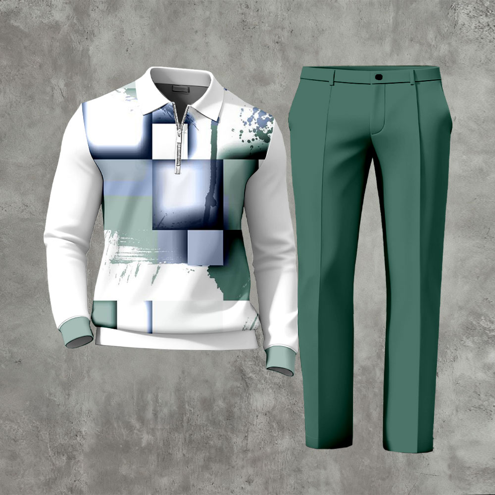 Men's Casual Irregular Asymmetric Patterns Polo-Collar Zipper Long Sleeved Trousers Two-Piece Set