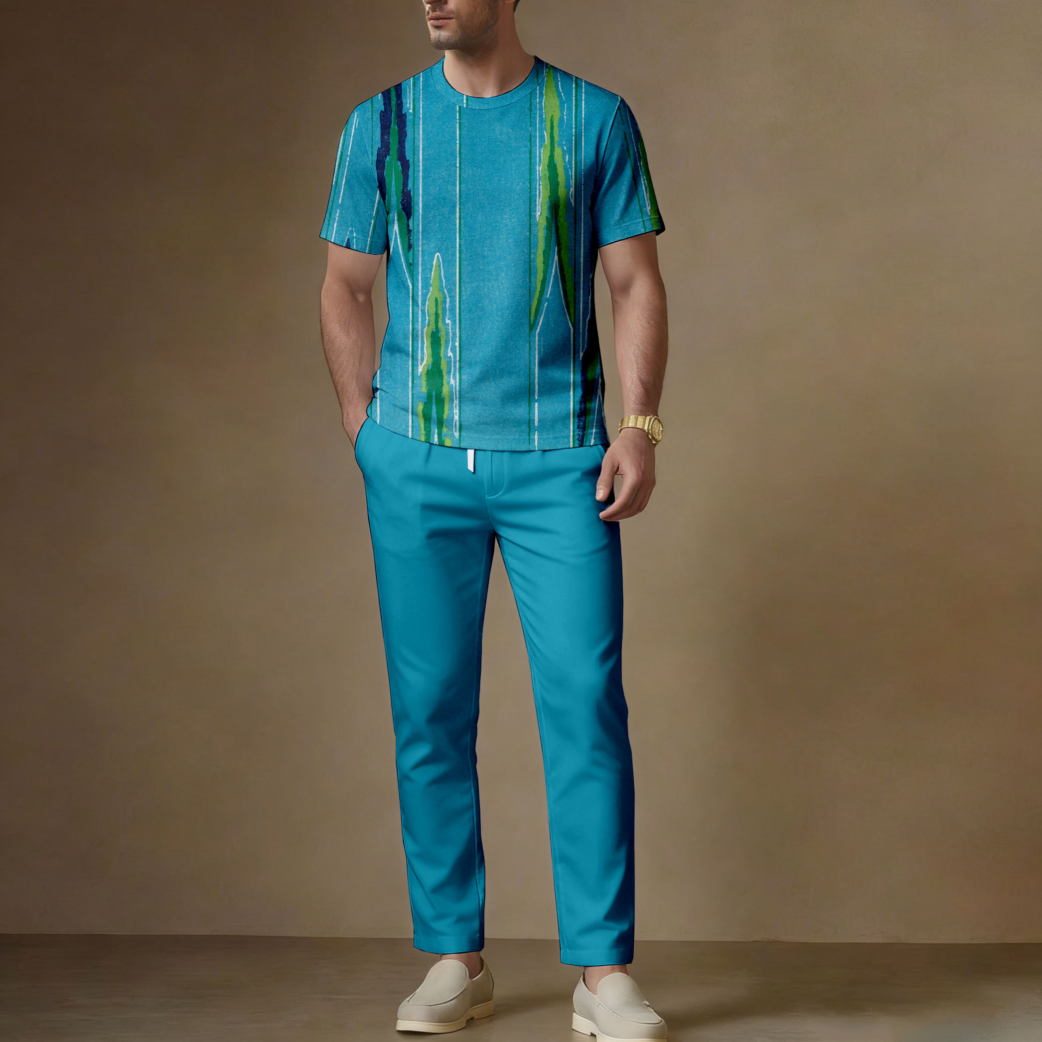 Men's Casual Blue & Green Art Graffiti Printed Crew Neck Short-Sleeve T-Shirt And Trousers Two-Piece Set