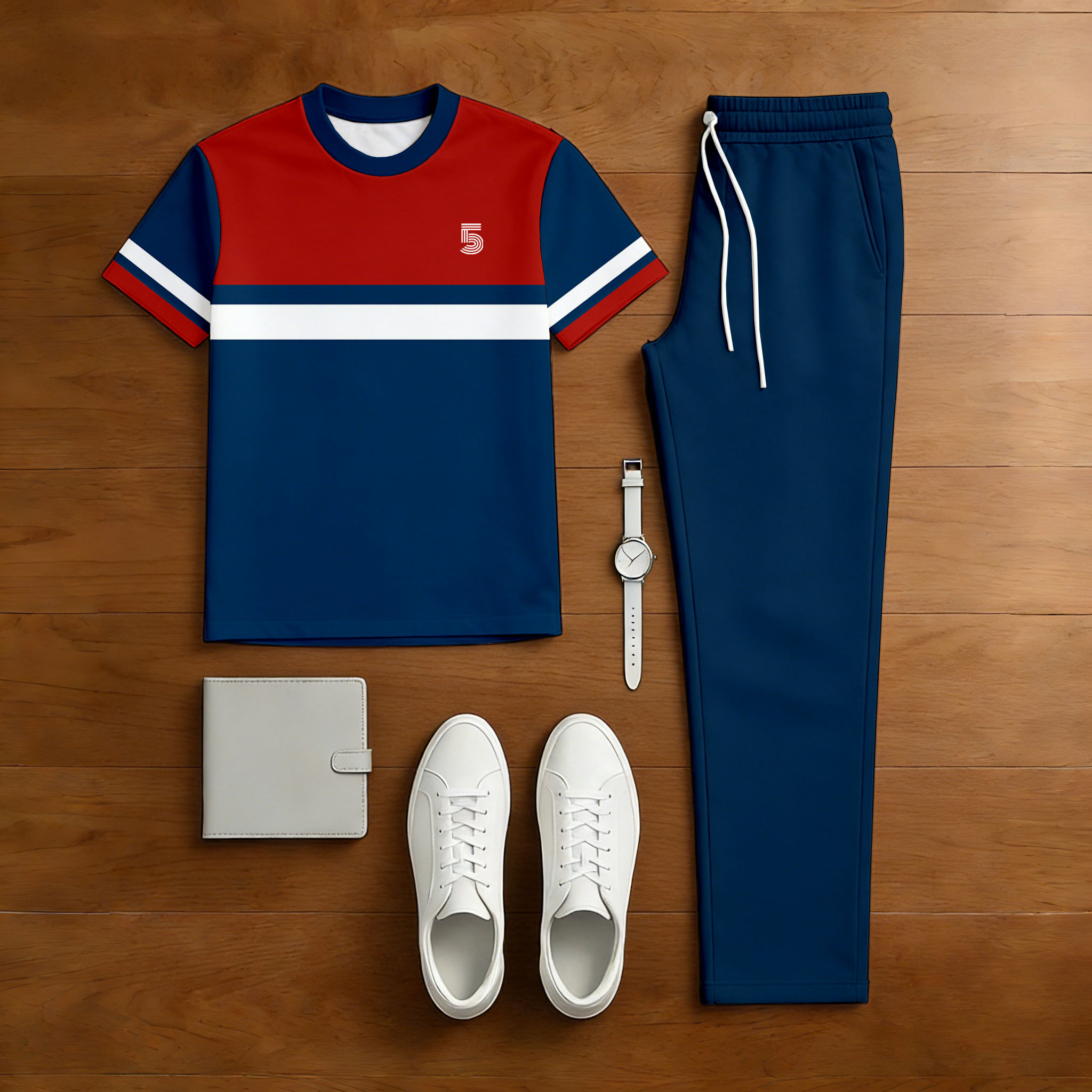 Men's Casual Red & Navy Blue Color Matching Printed Short Sleeved T-Shirt & Trousers Two-Piece Set
