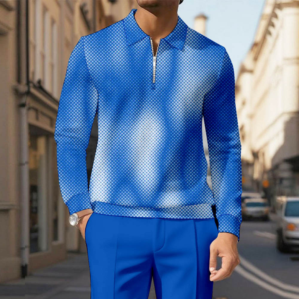 Men's Casual Royal Blue Color Matching Gradient Printed Polo-Collar Zipper Long Sleeved Trousers Two-Piece Set