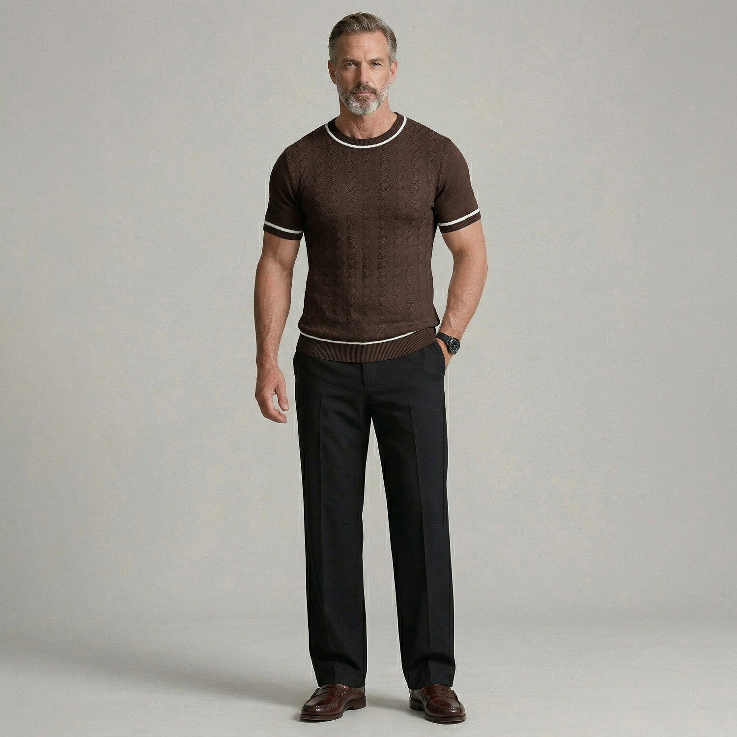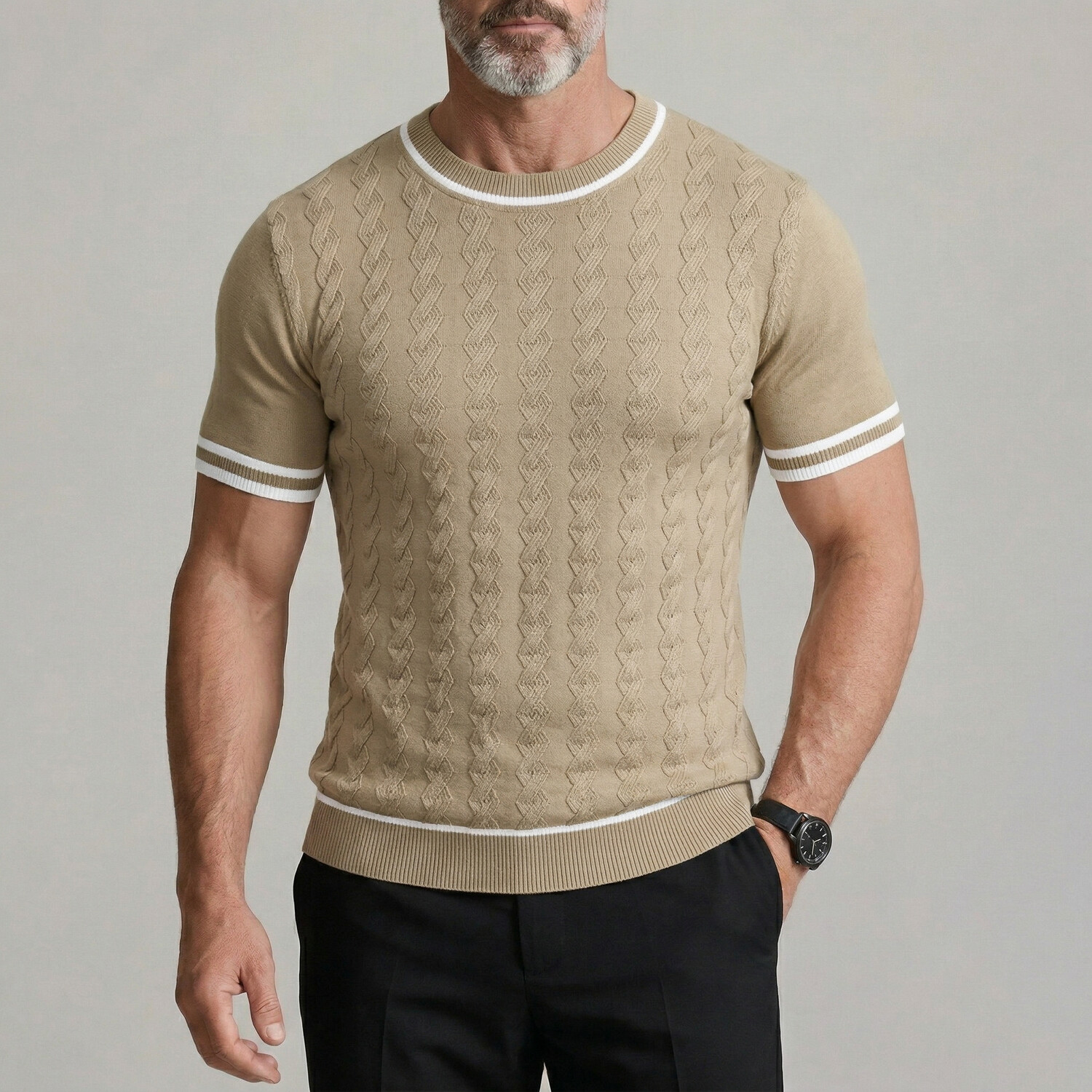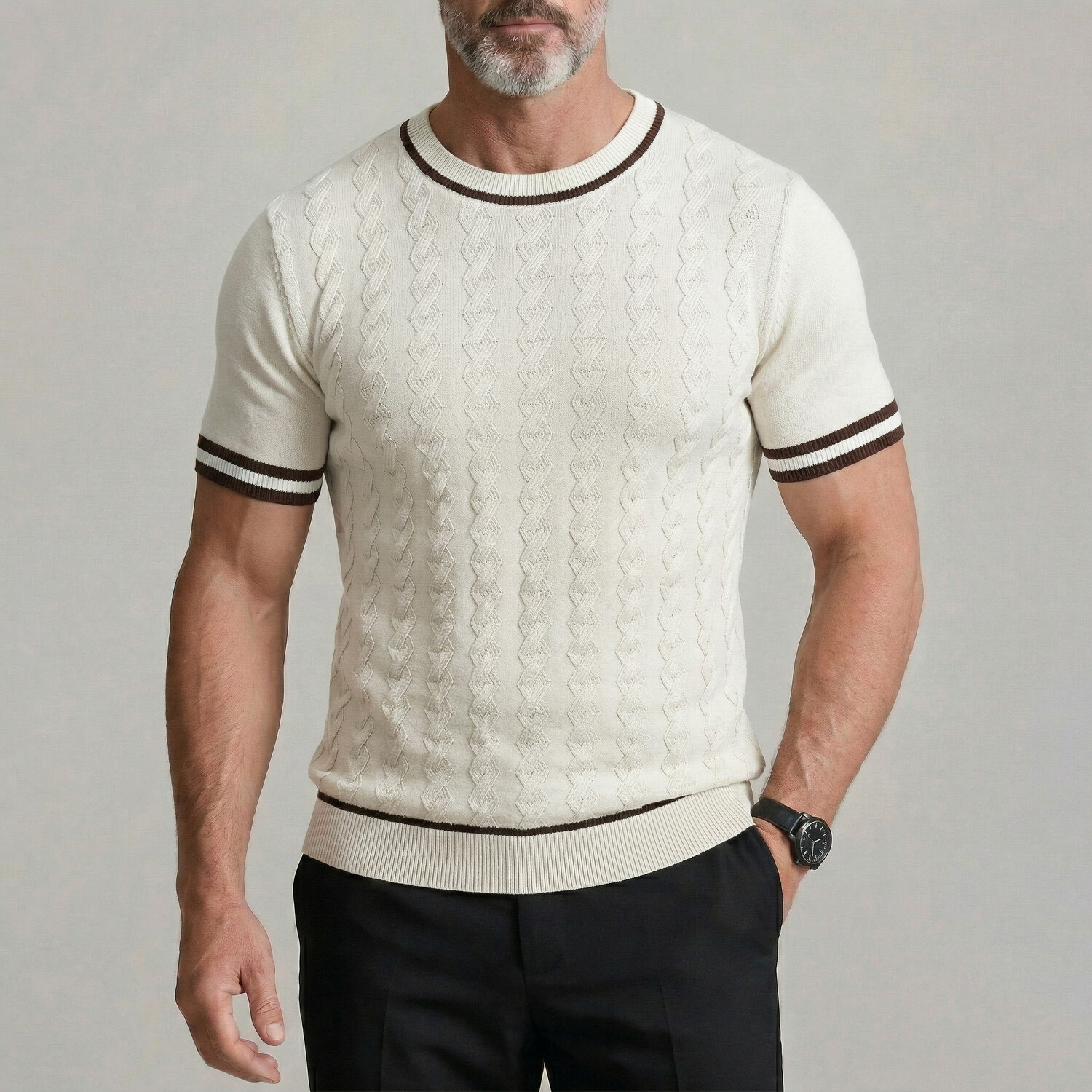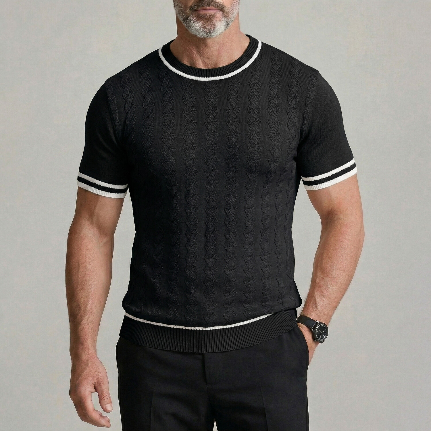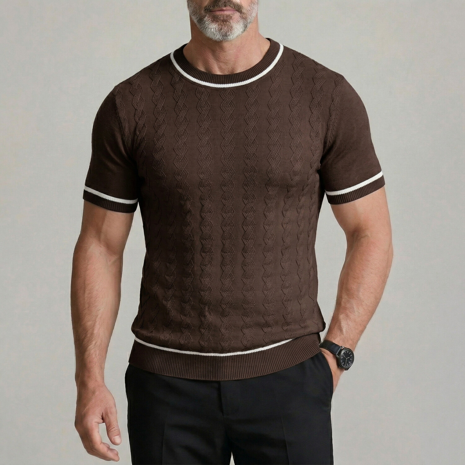 Men's Casual Solid Color Crew Neck Twisted Cable Knit Tight Fit T-Shirt