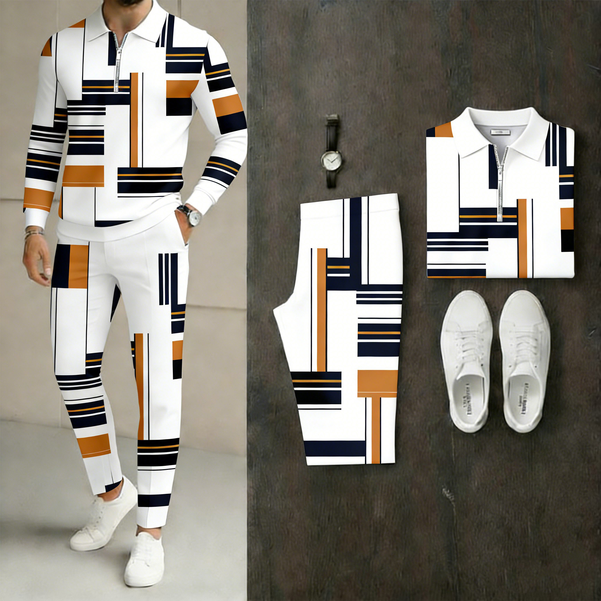 Men's Casual Whie & Multi Color Matching Geometric Printed Zipper Long Sleeved Polo Shirt & Trousers & Watch Three-Piece Set
