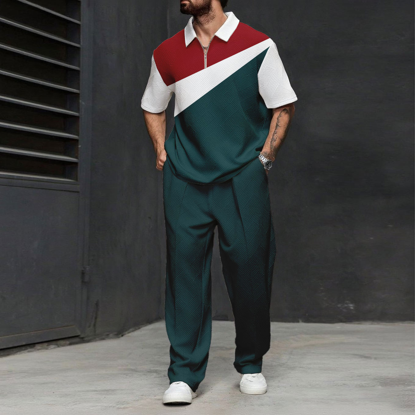 Men's Fashion Casual Color Matching Striped Printed Polo-Collar Zipper Short Sleeved Trousers Two-Piece Set
