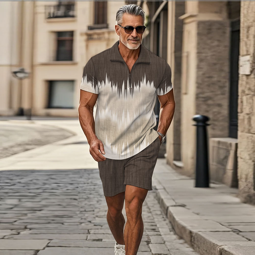 Men's Fashion Casual Zipper Polo Collar Geometric Printed Short-Sleeved Two-Piece Set