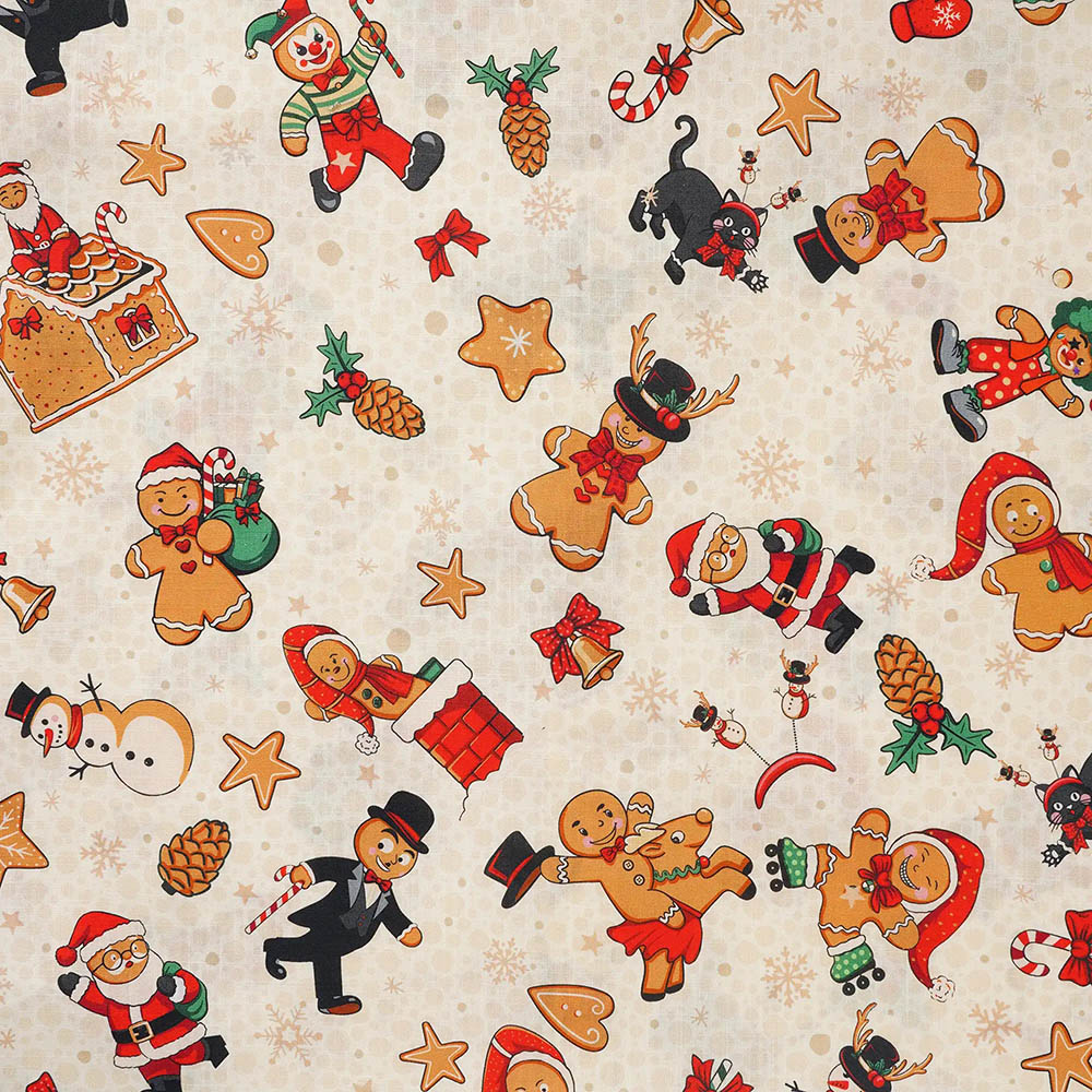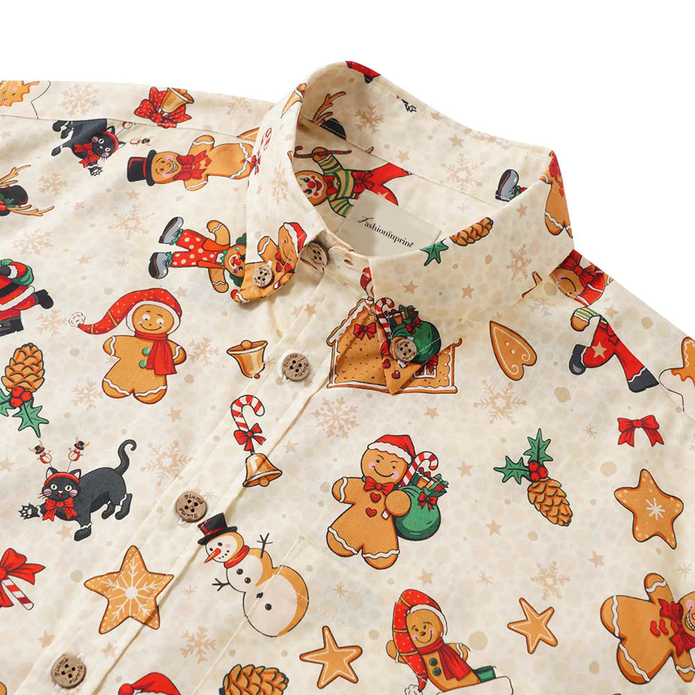 Men's Hawaiian Shirt Short Sleeve Button-Down 100% Cotton Beige Aloha Gingerbread Christmas Carnival